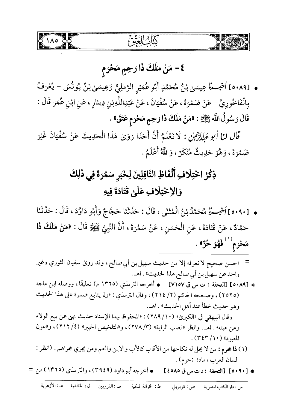 5089- أَخبَرنا عِيسَى بنُ مُحَمدٍ أَبو عُمَيْرٍ الرَّمْلِيُّ، وَعِيسَى بنُ يُونُسَ يُعْرَفُ بِالفَاخُورِيِّ، عَن ضَمْرَةَ، عَن سُفيانَ، عَن عَبدِ اللهِ بنِ دِينَارٍ، عَنِ ابْنِ عُمَرَ، قَالَ: قَالَ رَسُولُ اللهِ صَلى الله عَلَيهِ وسَلم: مَنْ مَلَكَ ذَا رَحِمٍ مَحْرَمٍ عَتَقَ.