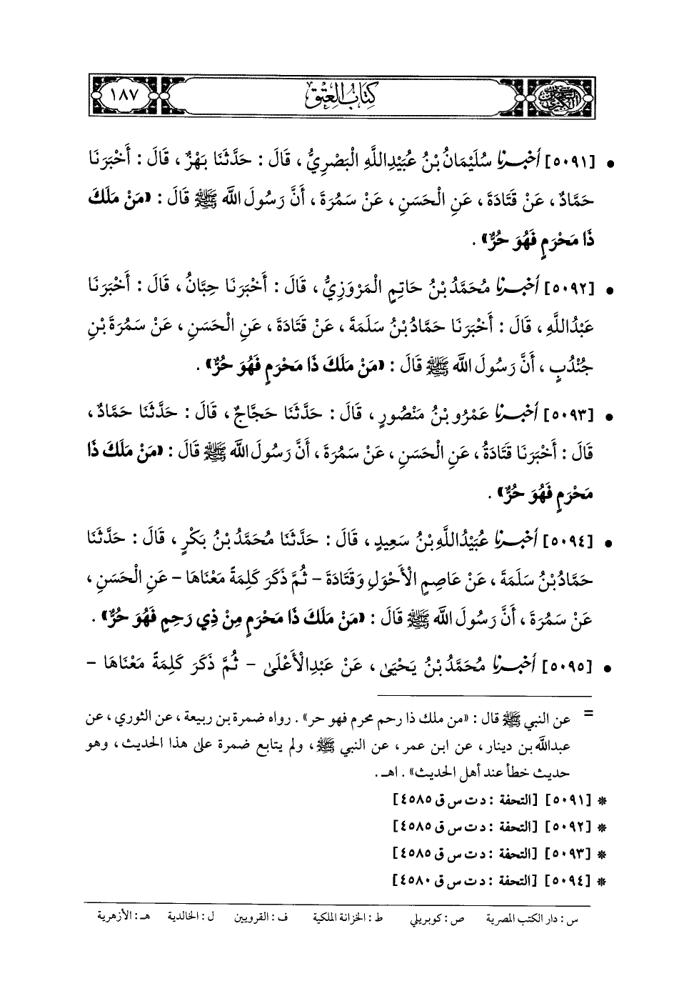 5091- أَخبَرنا سُلَيْمَانُ بنُ عُبَيْدِ اللهِ البَصْرِيُّ، قَالَ: حَدَّثنا بَهْزٌ، قَالَ: أَخبَرنا حَمَّادٌ، عَن قَتَادَةَ، عَنِ الحَسَنِ، عَن سَمُرَةَ، أَنَّ رَسُولَ اللهِ صَلى الله عَلَيهِ وسَلم قَالَ: مَنْ مَلَكَ ذَا مَحْرَمٍ، فَهُوَ حُرٌّ.
