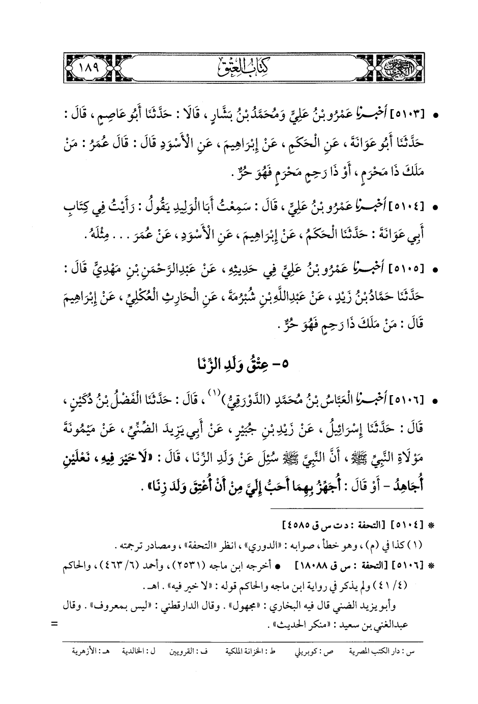 5103- أَخبَرنا عَمْرُو بنُ عَليٍّ، وَمُحَمدُ بنُ بَشَّارٍ، قَالا: حَدَّثنا أَبو عَاصِمٍ، قَالَ: حَدَّثنا أَبو عَوَانَةَ، عَنِ الحَكَمِ، عَن إِبْرَاهِيمَ، عَنِ الأَسْوَدِ، قَالَ: قَالَ عُمَرُ: مَنْ مَلَكَ ذَا مَحْرَمٍ أَوْ ذَا رَحِمٍ مَحْرَمٍ، فَهُوَ حُرٌّ.