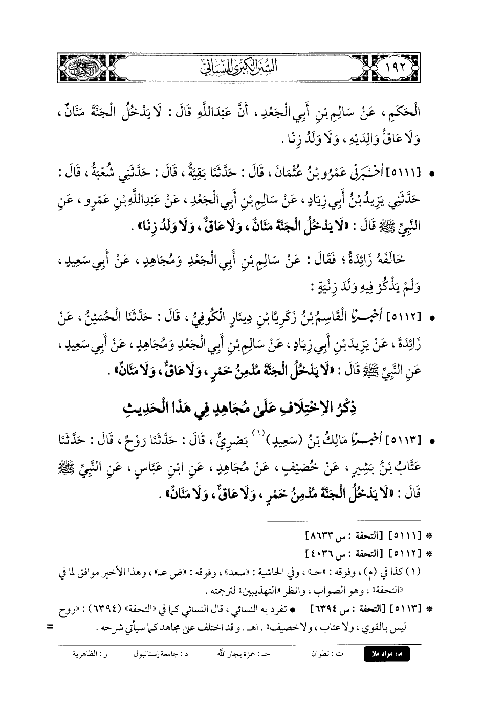 5111- أَخْبَرَنِي عَمْرُو بنُ عُثْمَانَ، قَالَ: حَدَّثنا بَقِيَّةُ، قَالَ: حَدَّثني شُعْبَةُ، قَالَ: حَدَّثني يَزِيدُ بنُ أَبي زِيَادٍ، عَن سَالِمِ بنِ أَبي الجَعْدِ، عَن عَبدِ اللهِ بنِ عَمْرٍو، عَنِ النَّبيِّ صَلى الله عَلَيهِ وسَلم قَالَ: لا يَدْخُلُ الجَنَّةَ مَنَّانٌ، وَلا عَاقٌّ، وَلا وَلَدُ زِنًا.