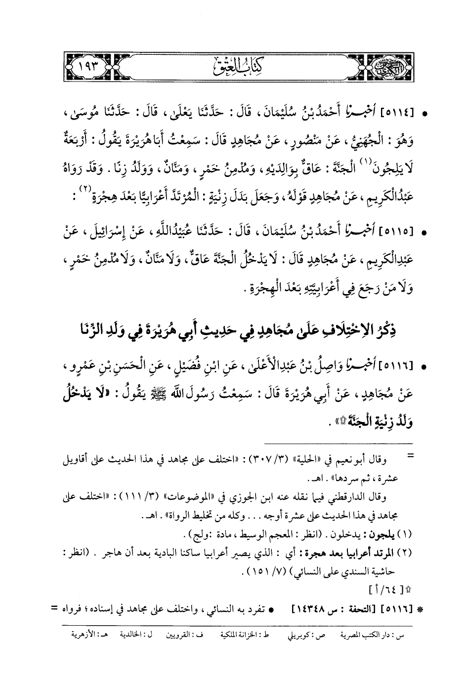 5115- أَخبَرنا أَحْمَدُ بنُ سُلَيْمَانَ، قَالَ: حَدَّثنا عُبَيْدُ اللهِ، عَن إِسرَائِيلَ، عَن عَبدِ الكَرِيمِ، عَن مُجَاهِدٍ، قَالَ: لا يَدْخُلُ الجَنَّةَ عَاقٌّ، وَلا مَنَّانٌ، وَلا مُدْمِنُ خَمْرٍ، وَلا مَنْ رَجَعَ فِي أَعْرَابِيَّتِهِ بَعْدَ الهِجْرَةِ.