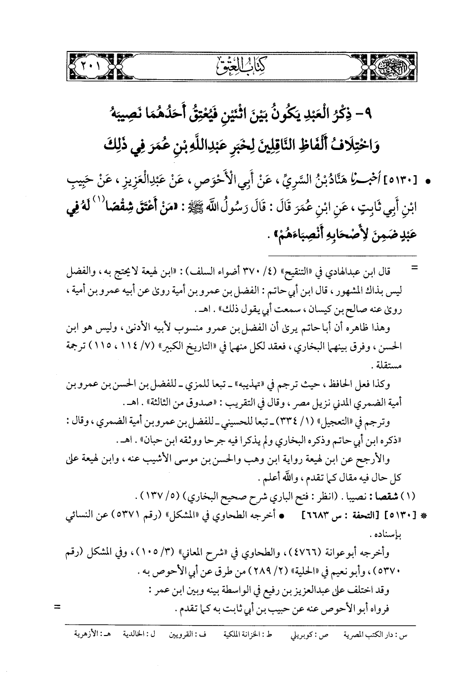 5130- أَخبَرنا هَنَّادُ بنُ السَّرِيِّ، عَن أَبي الأَحْوَصِ، عَن عَبدِ العَزِيزِ، عَن حَبِيبِ بنِ أَبي ثَابِتٍ، عَنِ ابْنِ عُمَرَ، قَالَ: قَالَ رَسُولُ اللهِ صَلى الله عَلَيهِ وسَلم: مَنْ أَعْتَقَ شِقْصًا لَهُ فِي عَبدٍ ضَمِنَ لأَصْحَابِهِ أَنْصِبَاءَهُمْ.