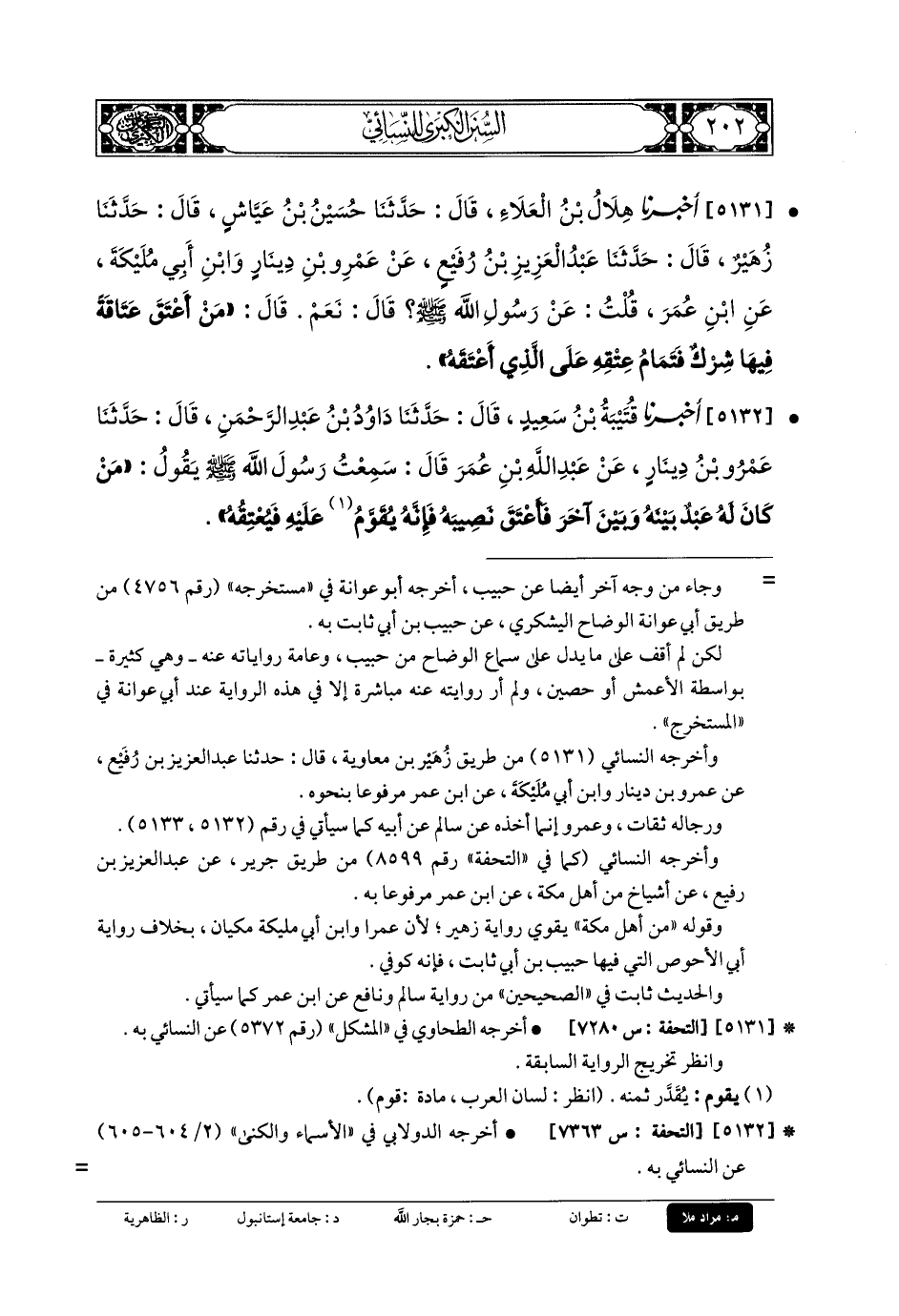 5131- أَخبَرنا هِلالُ بنُ العَلاءِ، قَالَ: حَدَّثنا حُسَيْنُ بنُ عَيَّاشٍ، قَالَ: حَدَّثنا زُهَيْرٌ، قَالَ: حَدَّثنا عَبدُ العَزِيزِ بنُ رَفِيعٍ، عَن عَمْرِو بنِ دِينَارٍ، وَابْنِ أَبي مُلَيْكَةَ، عَنِ ابْنِ عُمَرَ، قُلْتُ: عَن رَسُولِ اللهِ صَلى الله عَلَيهِ وسَلم؟ قَالَ: نَعَمْ، قَالَ: مَنْ أَعْتَقَ عَتَاقَةً فِيهَا شِرْكٌ، فَتَمَامُ عِتْقِهِ عَلَى الَّذِي أَعْتَقَهُ.
