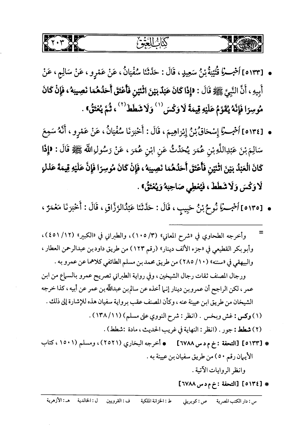 5135- أَخبَرنا نُوحُ بنُ حَبِيبٍ، قَالَ: حَدَّثنا عَبدُ الرَّزَّاقِ، قَالَ: أَخبَرنا مَعْمَرٌ، عَنِ الزُّهْرِيِّ، عَن سَالِمٍ، عَن أَبيهِ، أَنَّ النَّبيَّ صَلى الله عَلَيهِ وسَلم قَالَ: مَنْ أَعْتَقَ شِرْكًا لَهُ فِي عَبدٍ أَتَمَّ مَا بَقِيَ فِي مَالِهِ، إِذَا كَانَ لَهُ مَالٌ يَبْلُغُ ثَمَنَ العَبدِ.