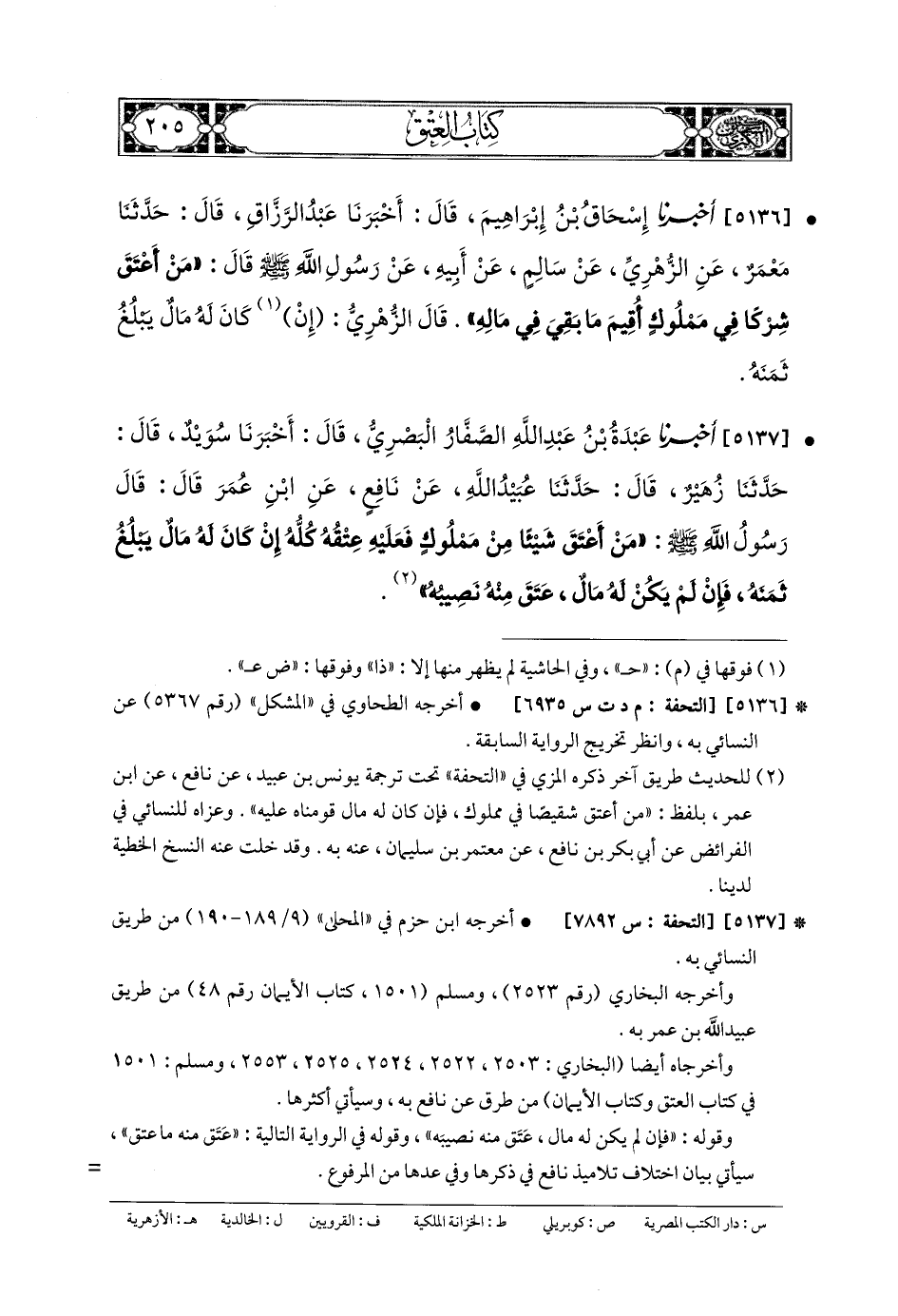 5136- أَخبَرنا إِسحَاقُ بنُ إِبْرَاهِيمَ، قَالَ: أَخبَرنا عَبدُ الرَّزَّاقِ، قَالَ: حَدَّثنا مَعْمَرٌ، عَنِ الزُّهْرِيِّ، عَن سَالِمٍ، عَن أَبيهِ، عَن رَسُولِ اللهِ صَلى الله عَلَيهِ وسَلم قَالَ: مَنْ أَعْتَقَ شِرْكًا فِي مَمْلُوكٍ أُقِيمَ مَا بَقِيَ فِي مَالِهِ.