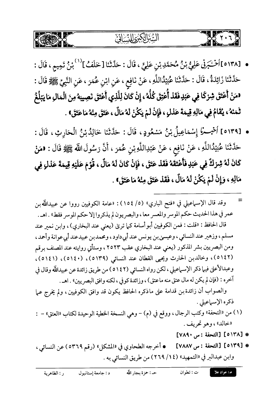 5138- أَخْبَرَنِي عَليُّ بنُ مُحَمدِ بنِ عَليٍّ، قَالَ: حَدَّثنا خَلَفُ بنُ تَمِيمٍ، قَالَ: حَدَّثنا زَائِدَةُ، قَالَ: حَدَّثنا عُبَيْدُ اللهِ، عَن نَافِعٍ، عَنِ ابْنِ عُمَرَ، عَنِ النَّبيِّ صَلى الله عَلَيهِ وسَلم قَالَ: مَنْ أَعْتَقَ شِرْكًا فِي عَبدٍ فَقَدْ أُعْتَقَ كُلُّهُ، إِنْ كَانَ لِلَّذِي أَعْتَقَ نَصِيبَهُ مِنَ المَالِ مَا يَبْلُغُ ثَمَنَهُ، يُقَامُ فِي مَالِهِ قِيمَةَ عَدْلٍ، فَإِنْ لَمْ يَكُنْ لَهُ مَالٌ عَتَقَ مِنْهُ مَا عَتَقَ.