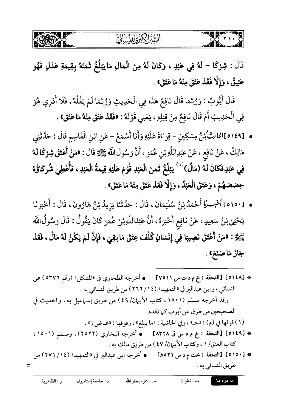 5150- أَخبَرنا أَحْمَدُ بنُ سُلَيْمَانَ، قَالَ: حَدَّثنا يَزِيدُ بنُ هَارُونَ، قَالَ: أَخبَرنا يَحْيَى بنُ سَعِيدٍ، عَن نَافِعٍ أَخْبَرَهُ؛ أَنَّ عَبدَ اللهِ بْنَ عُمَرَ كَانَ يَقُولُ: قَالَ رَسُولُ اللهِ صَلى الله عَلَيهِ وسَلم: مَنْ أَعْتَقَ نَصِيبًا فِي إِنْسَانٍ كُلِّفَ عِتْقَ مَا بَقِيَ، فَإِنْ لَمْ يَكُنْ لَهُ مَالٌ، فَقَدْ جَازَ مَا صَنَعَ.