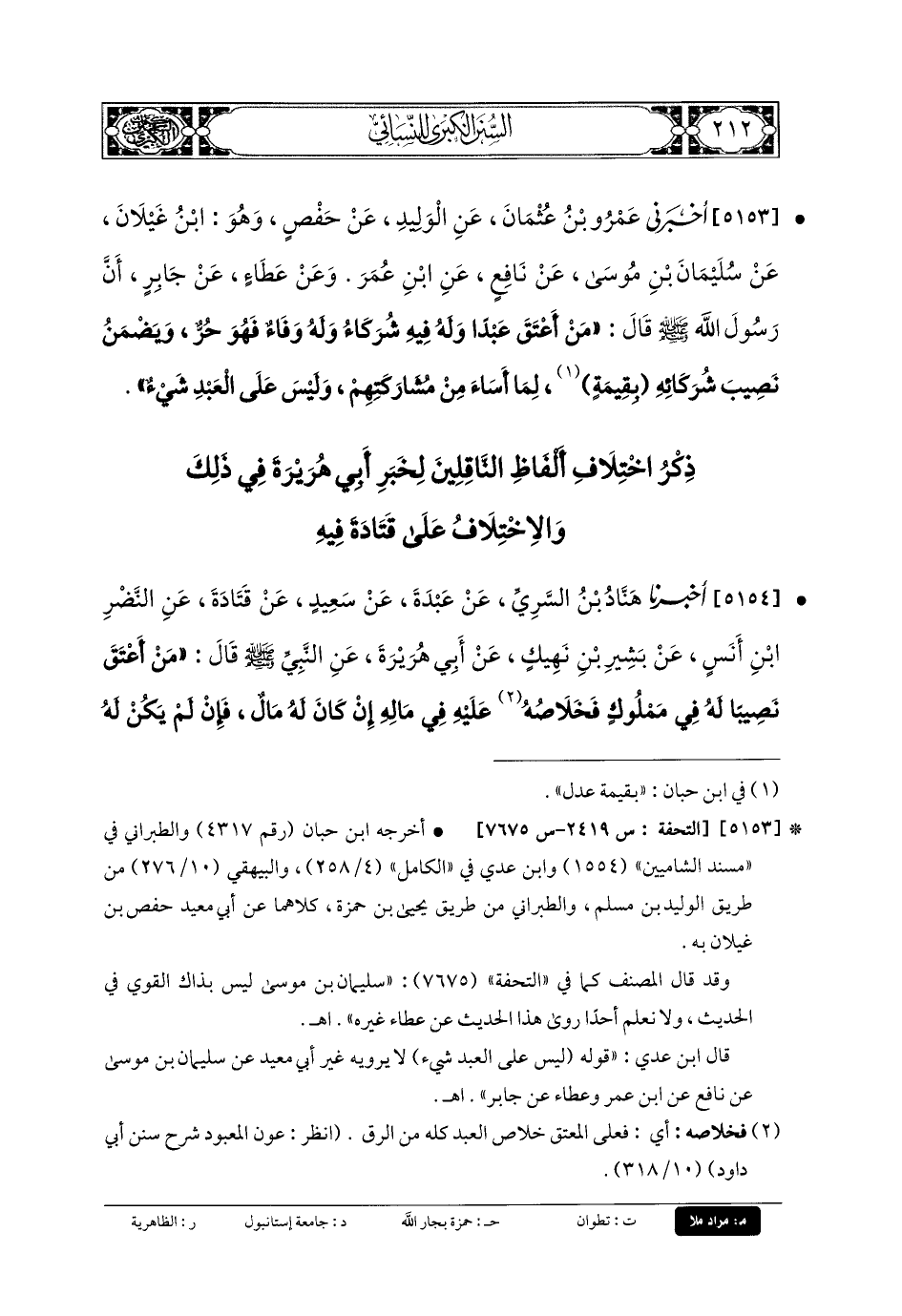 5153- أَخْبَرَنِي عَمْرُو بنُ عُثْمَانَ، عَنِ الوَلِيدِ، عَن حَفْصٍ، وَهُوَ ابْنُ غَيْلانَ، عَن سُلَيْمَانَ بْنَ مُوسَى، عَن نَافِعٍ، عَنِ ابْنِ عُمَرَ، وَعَن عَطَاءٍ، عَن جَابِرٍ، أَنَّ رَسُولَ اللهِ صَلى الله عَلَيهِ وسَلم قَالَ: مَنْ أَعْتَقَ عَبدًا وَلَهُ فِيهِ شُرَكَاءُ، وَلَهُ وَفَاءٌ فَهُوَ حُرٌّ، ويَضْمَنُ نَصِيبَ شُرَكَائِهِ بِقِيمَةٍ لِمَا أَسَاءَ مِنْ مُشَارَكَتِهِمْ وَلَيْسَ عَلَى العَبدِ شَيْءٌ.