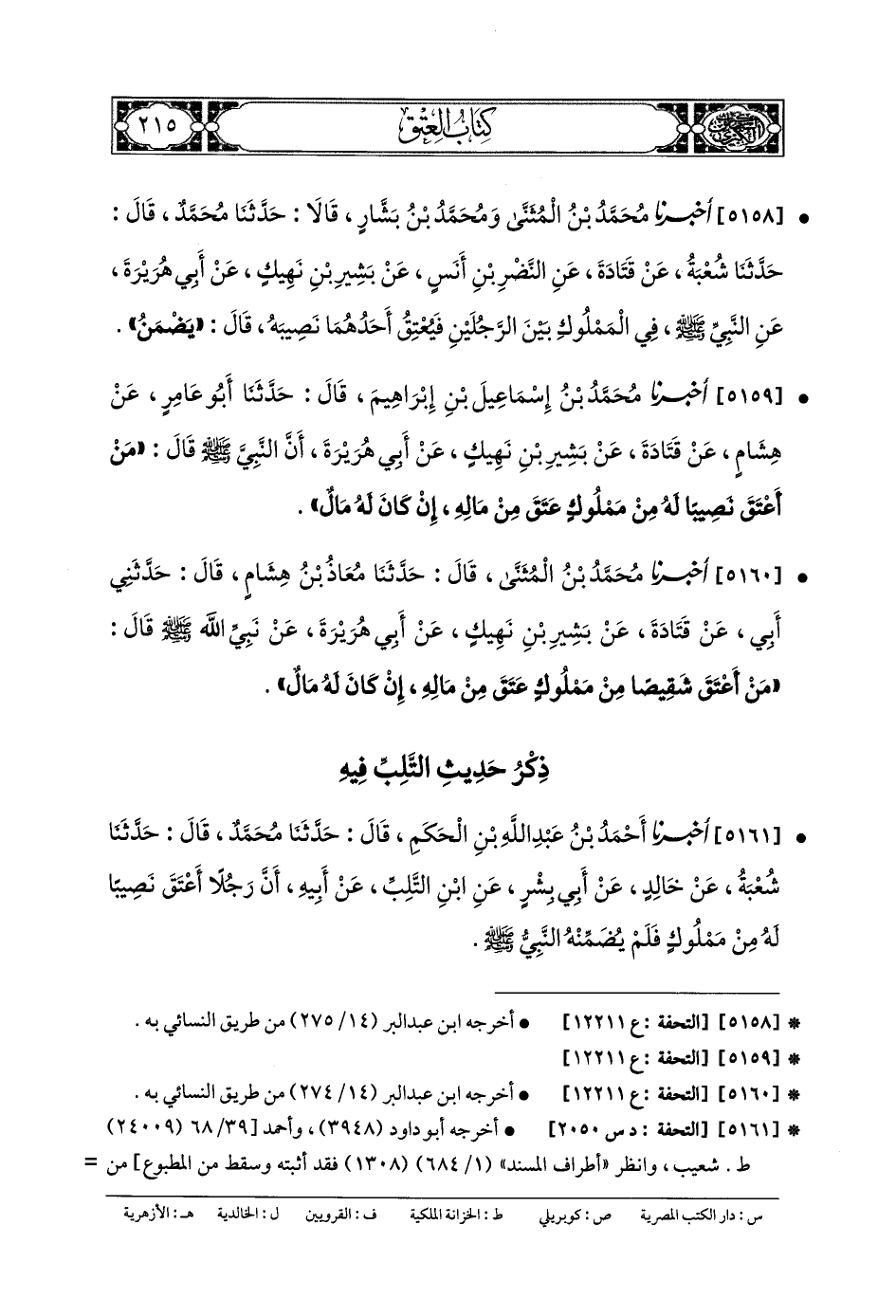 5161- أَخبَرنا أَحْمَدُ بنُ عَبدِ اللهِ بنِ الحَكَمِ، قَالَ: حَدَّثنا مُحَمدٌ، قَالَ: حَدَّثنا شُعْبَةُ، عَن خَالِدٍ، عَن أَبي بِشْرٍ، عَنِ ابْنِ التَّلِبِّ، عَن أَبيهِ، أَنَّ رَجُلاً أَعْتَقَ نَصِيبًا لَهُ فِي مَمْلُوكٍ، فَلَمْ يُضَمِّنْهُ النَّبيُّ صَلى الله عَلَيهِ وسَلم.