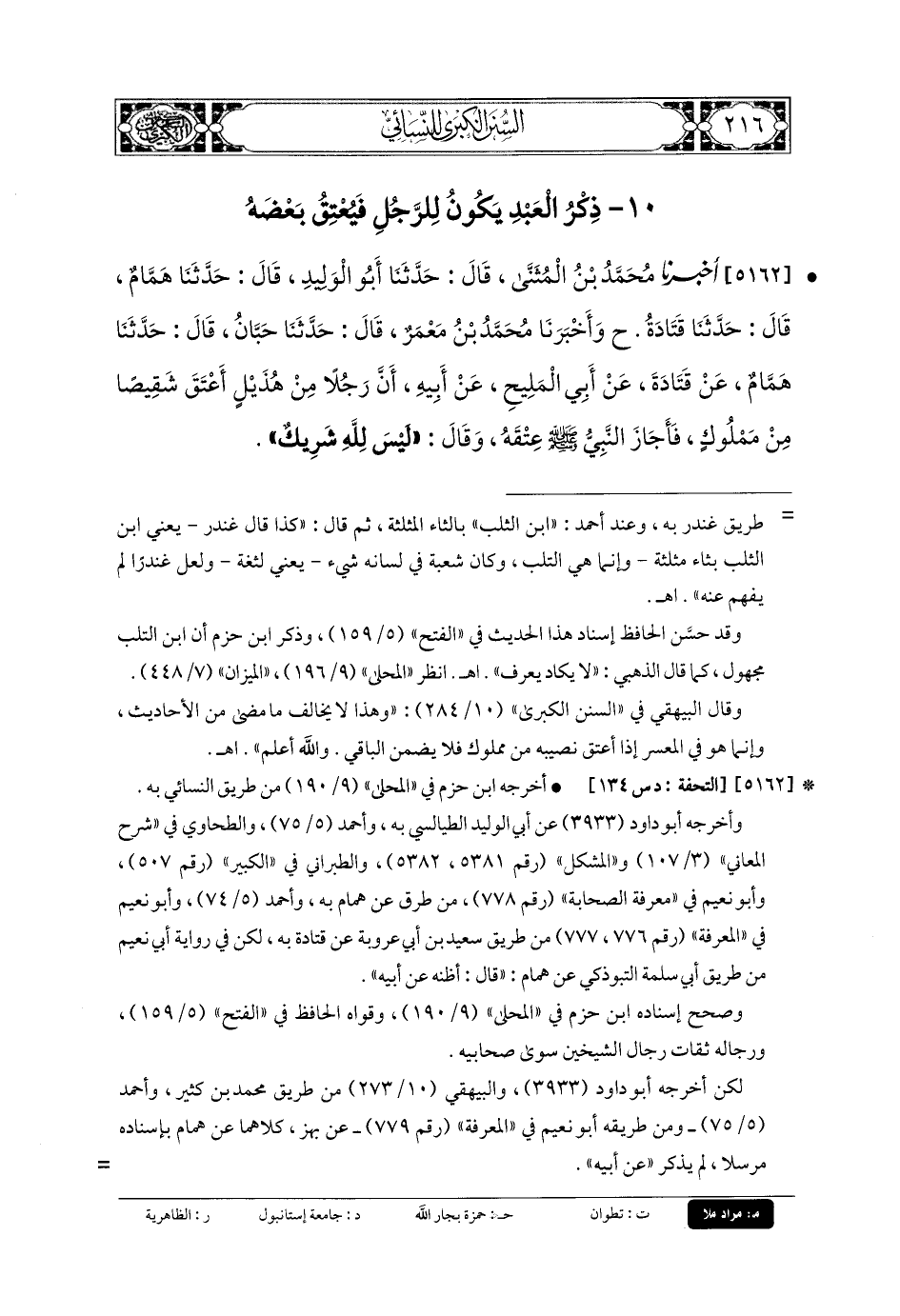 5162- أَخبَرنا مُحَمدُ بنُ المُثَنَّى، قَالَ: حَدَّثنا أَبو الوَلِيدِ، قَالَ: حَدَّثنا هَمَّامٌ، قَالَ: حَدَّثنا قَتَادَةُ (ح) وَأَخبَرنا مُحَمدُ بنُ مَعْمَرٍ، قَالَ: حَدَّثنا حَبَّانُ، قَالَ: حَدَّثنا هَمَّامٌ، عَن قَتَادَةَ، عَن أَبي المَلِيحِ، عَن أَبيهِ، أَنَّ رَجُلاً مِنْ هُذَيْلٍ أَعْتَقَ شَقِيصًا مِنْ مَمْلُوكٍ، فَأَجَازَ النَّبيُّ صَلى الله عَلَيهِ وسَلم عِتْقَهُ، وَقَالَ: لَيْسَ للهِ شَرِيكٌ.