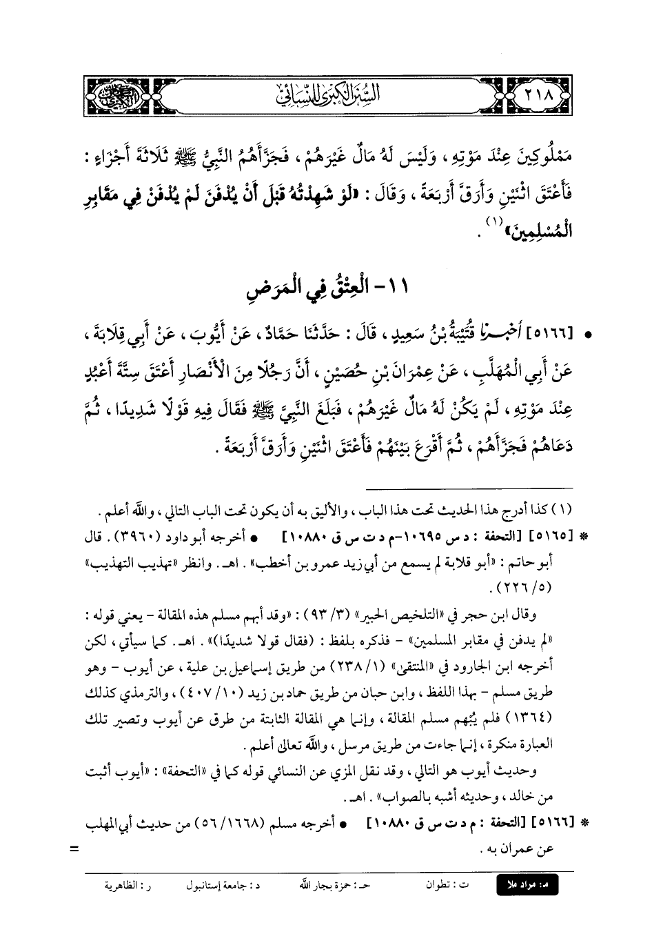 5166- أَخبَرنا قُتَيبَةُ بنُ سَعِيدٍ، قَالَ: حَدَّثنا حَمَّادٌ، عَن أَيوبَ، عَن أَبي قِلابَةَ، عَن أَبي المُهَلَّبِ، عَن عِمْرَانَ بنِ حُصَيْنٍ، أَنَّ رَجُلاً مِنَ الأَنْصَارِ، أَعْتَقَ سِتَّةَ أَعْبُدٍ عِنْدَ مَوْتِهِ لَمْ يَكُنْ لَهُ مَالٌ غَيْرُهُمْ، فَبَلَغَ النَّبيَّ صَلى الله عَلَيهِ وسَلم، فَقَالَ فِيهِ قَوْلاً شَدِيدًا، ثُمَّ دَعَاهُمْ، فَجَزَّأَهُمْ، ثُمَّ أَقْرَعَ بَيْنَهُمْ، فَأَعْتَقَ اثْنَيْنِ، وَأَرَقَّ أَرْبَعَةً.