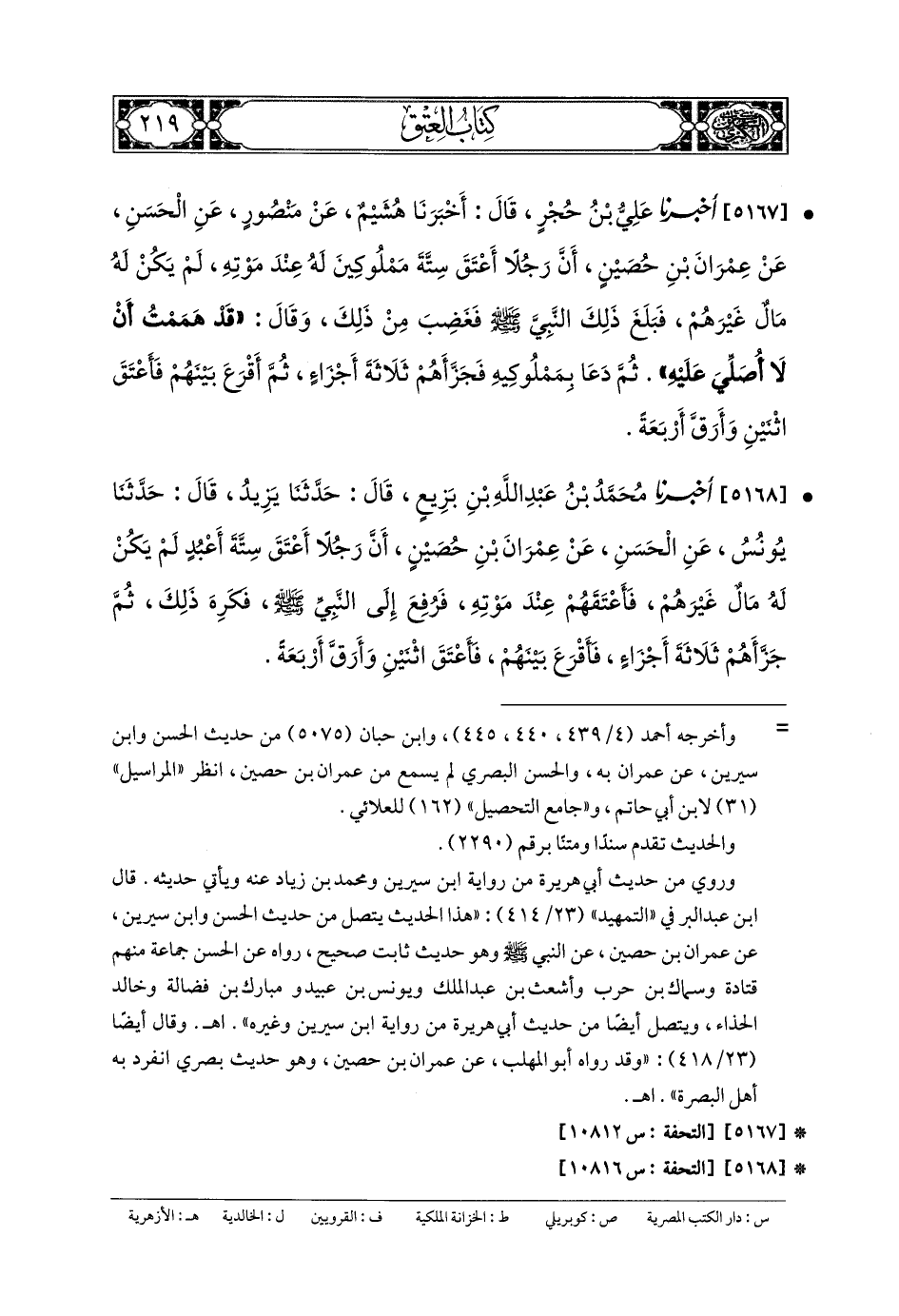 5167- أَخبَرنا عَليُّ بنُ حُجْرٍ، قَالَ: أَخبَرنا هُشَيْمٌ، عَن مَنْصُورٍ، عَنِ الحَسَنِ، عَن عِمْرَانَ بنِ حُصَيْنٍ، أَنَّ رَجُلاً أَعْتَقَ سِتَّةً مَمْلُوكِينَ لَهُ عِنْدَ مَوْتِهِ لَمْ يَكُنْ لَهُ مَالٌ غَيْرُهُمْ، فَبَلَغَ ذَلِكَ النَّبيَّ صَلى الله عَلَيهِ وسَلم، فَغَضِبَ مِنْ ذَلِكَ، وَقَالَ: قَدْ هَمَمْتُ أَنْ لا أُصَلِّيَ عَلَيْهِ، ثُمَّ دَعَا بِمَمْلُوكِيهِ، فَجَزَّأَهُمْ ثَلاثَةَ أَجْزَاءٍ، ثُمَّ أَقْرَعَ بَيْنَهُمْ، فَأَعْتَقَ اثْنَيْنِ، وَأَرَقَّ أَرْبَعَةً.