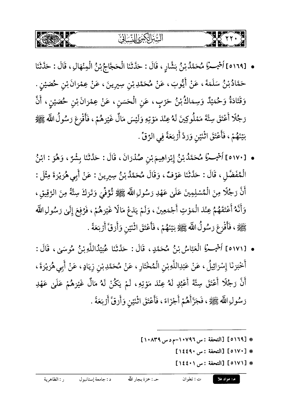 5169- أَخبَرنا مُحَمدُ بنُ بَشَّارٍ، قَالَ: حَدَّثنا الحَجَّاجُ بنُ المِنْهَالِ، قَالَ: حَدَّثنا حَمَّادُ بنُ سَلَمَةَ، عَن أَيوبَ، عَن مُحَمدِ بنِ سِيرِينَ، عَن عِمْرَانَ بنِ حُصَيْنٍ، وَقَتَادَةُ، وَحُمَيْدٍ، وَسِمَاكِ بنِ حَرْبٍ، عَنِ الحَسَنِ، عَن عِمْرَانَ بنِ حُصَيْنٍ، أَنَّ رَجُلاً أَعْتَقَ سِتَّةً مَمْلُوكِينَ لَهُ عِنْدَ مَوْتِهِ وَلَيْسَ مَالٌ غَيْرُهُمْ، فَأَقْرَعَ رَسُولُ اللهِ صَلى الله عَلَيهِ وسَلم بَيْنَهُمْ، فَأَعْتَقَ اثْنَيْنِ، وَرَدَّ أَرْبَعَةً فِي الرِّقِّ.