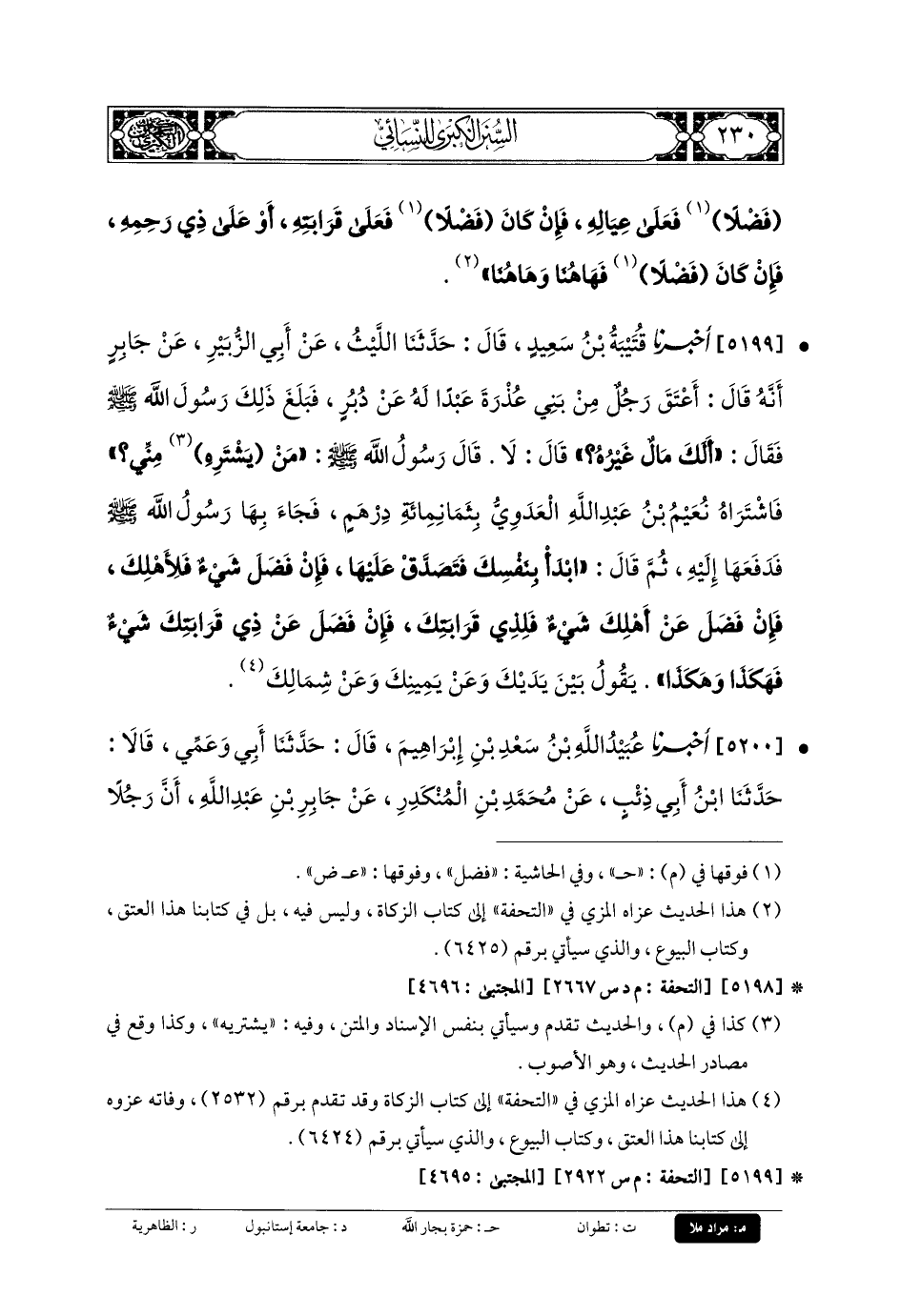 5199- أَخبَرنا قُتَيبَةُ بنُ سَعِيدٍ، قَالَ: حَدَّثنا اللَّيْثُ، عَن أَبي الزُّبَيْرِ، عَن جَابِرٍ، أَنَّهُ قَالَ: أَعْتَقَ رَجُلٌ مِنْ بَنِي عُذْرَةَ عَبدًا لَهُ عَن دُبُرٍ، فَبَلَغَ ذَلِكَ رَسُولَ اللهِ صَلى الله عَلَيهِ وسَلم، فَقَالَ: أَلَكَ مَالٌ غَيْرَهُ؟ قَالَ: لا، قَالَ رَسُولُ اللهِ صَلى الله عَلَيهِ وسَلم: مَنْ يَشْتَرِهِ مِنِّي؟ فَاشْتَرَاهُ نُعَيْمُ بنُ عَبدِ اللهِ العَدَوِيُّ بِثَمَانِ مِئَةِ دِرْهَمٍ، فَجَاءَ بِهَا رَسُولُ اللهِ صَلى الله عَلَيهِ وسَلم، فَدَفَعَهَا إِلَيْهِ، ثُمَّ قَالَ: ابْدَأْ بِنَفْسِكَ فَتَصَدَّقْ عَلَيْهَا، فَإِنْ فَضَلَ شَيْءٌ فَلأَهْلِكَ، فَإِنْ فَضَلَ عَن أَهْلِكَ شَيْءٌ فَلِذِي قَرَابَتِكَ، فَإِنْ فَضَلَ عَن ذِي قَرَابَتِكَ شَيْءٌ فَهَكَذَا وَهَكَذَا، يَقُولُ: بَيْنَ يَدَيْكَ وَعَن يَمِينِكَ وَعَن شِمَالِكَ.
