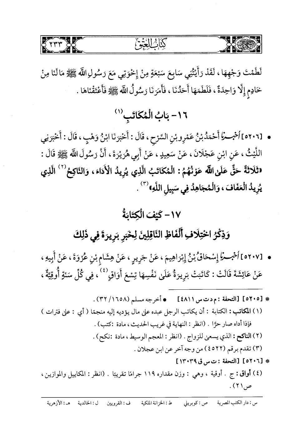 5206- أَخبَرنا أَحْمَدُ بنُ عَمْرِو بنِ السَّرْحِ، قَالَ: أَخبَرنا ابْنُ وَهْبٍ، قَالَ: أَخْبَرَنِي اللَّيْثُ، عَنِ ابْنِ عَجْلانَ، عَن سَعِيدٍ، عَن أَبي هُرَيْرَةَ، أَنَّ رَسُولَ اللهِ صَلى الله عَلَيهِ وسَلم قَالَ: ثَلاثَةٌ حَقٌّ عَلَى اللهِ عَوْنُهُمُ: المُكَاتَبُ الَّذِي يُرِيدُ الأَدَاءَ، وَالنَّاكِحُ الَّذِي يُرِيدُ العَفَافَ، وَالمُجَاهِدُ فِي سَبِيلِ اللهِ.