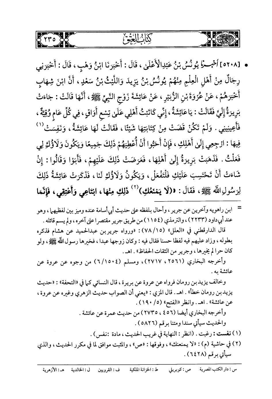 5208 - أَخبَرنا يُونُسُ بنُ عَبدِ الأَعْلَى، قَالَ: أَخبَرنا ابْنُ وَهْبٍ، قَالَ: أَخْبَرَنِي رِجَالٌ مِنْ أَهْلِ العِلْمِ مِنْهُمْ: يُونُسُ بنُ يَزِيدَ، وَاللَّيْثُ بنُ سَعْدٍ، أَنَّ ابْنَ شِهَابٍ أَخْبَرَهُمْ عَن عُرْوَةَ بنِ الزُّبَيْرِ، عَن عَائِشَةَ، زَوْجِ النَّبيِّ صَلى الله عَلَيهِ وسَلم أَنَّهَا قَالَتْ: جَاءَتْ بَرِيرَةُ إِلَيَّ، فَقَالَتْ: يَا عَائِشَةُ إِنِّي كَاتَبْتُ أَهْلِي عَلَى تِسْعِ أَوَاقٍ فِي كُلِّ عَامٍ وقِيَّةٌ، فَأَعِينِينِي، وَلَمْ تَكُنْ قَضَتْ مِنْ كِتَابَتِهَا شَيْئًا، فَقَالَتْ لَهَا عَائِشَةُ وَنَفِسَتْ فِيهَا: ارْجِعِي إِلَى أَهْلِكِ فَإِنْ أَحَبُّوا أَنْ أُعْطِيَهُمْ ذَلِكَ جَمِيعًا، وَيَكُونُ وَلاؤُكِ لِي فَعَلْتُ، فَذَهَبَتْ بَرِيرَةُ إِلَى أَهْلِهَا، فَعَرَضَتْ ذَلِكَ عَلَيْهِمْ، فَأَبَوْا وَقَالُوا: إِنْ شَاءَتْ أَنْ تَحْتَسِبَ عَلَيْكِ، فَلْتَفْعَلْ وَيَكُونَ وَلاؤُكِ لَنَا، فَذَكَرَتْ عَائِشَةُ ذَلِكَ لِرَسُولِ اللهِ صَلى الله عَلَيهِ وسَلم، فَقَالَ: لا يَمْنَعُكِ ذَلِكَ مِنْهَا، ابْتَاعِي وَأَعْتِقِي، فَإِنَّمَا الوَلاءُ لِمَنْ أَعْتَقَ، فَفَعَلْتُ، وَقَامَ رَسُولُ اللهِ صَلى الله عَلَيهِ وسَلم فِي النَّاسِ، فَحَمِدَ اللهَ وَأَثْنَى عَلَيْهِ، ثُمَّ قَالَ: مَا بَالُ أَنَاسٍ يَشْتَرِطُونَ شُرُوطًا لَيْسَتْ فِي كِتَابِ اللهِ، مَنِ اشْتَرَطَ شَرْطًا لَيْسَ فِي كِتَابِ اللهِ، فَهُوَ بَاطِلٌ، وَإِنْ كَانَ مِئَةَ شَرْطٍ، قَضَاءُ اللهِ أَحَقُّ، وَشَرْطُ اللهِ أَوْثَقُ، وَإِنَّمَا الوَلاءُ لِمَنْ أَعْتَقَ.