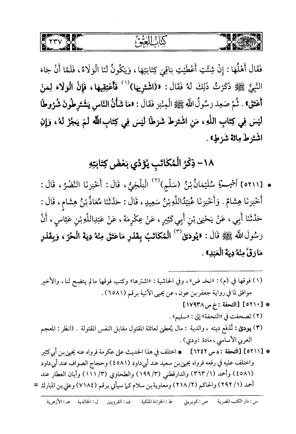 5211 - أَخبَرنا سُلَيْمَانُ بنُ سَلْمٍ البَلْخِيُّ، قَالَ: أَخبَرنا النَّضْرُ، قَالَ: أَخبَرنا هِشَامٌ (ح) وَأَخبَرنا عُبَيْدُ اللهِ بنُ سَعِيدٍ، قَالَ: حَدَّثنا مُعَاذُ بنُ هِشَامٍ، قَالَ: حَدَّثنا أَبي، عَن يَحْيَى بنِ أَبي كَثِيرٍ، عَن عِكْرِمَةَ، عَن عَبدِ اللهِ بنِ عَبَّاسٍ، أَنَّ رَسُولَ اللهِ صَلى الله عَلَيهِ وسَلم قَالَ: يُودَى المُكَاتَبُ بِقَدْرِ مَا عَتَقَ مِنْهُ دِيَةَ الحُرِّ، وَبِقَدْرِ مَا رَقَّ مِنْهُ دِيَةَ العَبدِ.