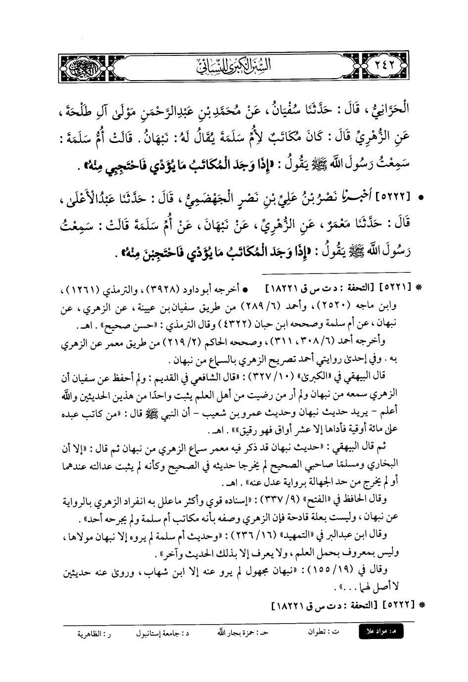 5222- أَخبَرنا نَصْرُ بنُ عَليِّ بنِ نَصْرٍ الجَهْضَمِيُّ، قَالَ: حَدَّثنا عَبدُ الأَعْلَى، قَالَ: حَدَّثنا مَعْمَرٌ، عَنِ الزُّهْرِيِّ، عَن نَبْهَانَ، عَن أُمِّ سَلَمَةَ، قَالَتْ: سَمِعْتُ رَسُولَ اللهِ صَلى الله عَلَيهِ وسَلم يَقُولُ: إِذَا وَجَدَ المُكَاتَبُ مَا يُؤَدِّي، فَاحْتَجِبْنَ مِنْهُ.