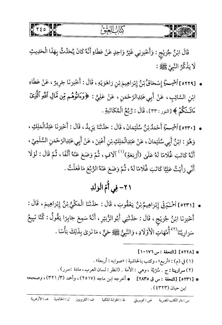5231- أَخْبَرَنِي إِبْرَاهِيمُ بنُ يَعْقُوبَ، قَالَ: حَدَّثنا المَكِّيُّ بنُ إِبْرَاهِيمَ، قَالَ: أَخبَرنا ابْنُ جُرَيْجٍ، قَالَ: حَدَّثني أَبو الزُّبَيْرِ، أَنَّهُ سَمِعَ جَابِرًا يَقُولُ: كُنَّا نَبِيعُ سَرَارِيَّنَا أُمَّهَاتِ الأَوْلادِ، وَالنَّبيُّ صَلى الله عَلَيهِ وسَلم حَيٌّ مَا نَرَى بِذَلِكَ بَأْسًا.
