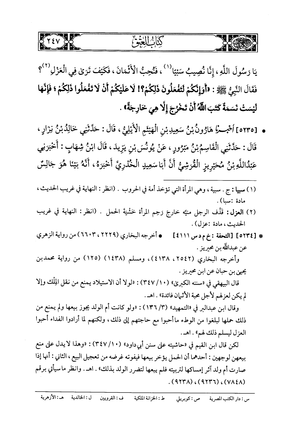 5235- أَخبَرنا هَارُونُ بنُ سَعِيدِ بنِ الهَيْثَمِ الأَيْلِيُّ، قَالَ: حَدَّثني خَالِدُ بنُ نِزَارٍ، قَالَ: حَدَّثنا القَاسِمُ بنُ مَبْرُورٍ، عَن يُونُسَ بنِ يَزِيدَ، قَالَ ابْنُ شِهَابٍ: أَخْبَرَنِي عَبدُ اللهِ بنُ مُحَيْرِيزٍ القُرَشِيُّ، أَنَّ أَبَا سَعِيدٍ الخُدْرِيِّ أَخْبَرَهُ، أَنَّهُ بَيْنَا هُوَ جَالِسٌ عِنْدَ رَسُولِ اللهِ صَلى الله عَلَيهِ وسَلم، قَالَ رَجُلٌ مِنَ الأَنْصَارِ: يَا رَسُولَ اللهِ، إِنَّا نُصِيبُ سَبَايَا، وَنُحِبُّ الأَثْمَانَ، فَكَيْفَ تَرَى فِي العَزْلِ؟ فَقَالَ رَسُولُ اللهِ صَلى الله عَلَيهِ وسَلم: أَوَ إِنَّكُمْ لَتَفْعَلُونَ ذَلِكَ؟ لا عَلَيْكُمْ أَنْ لا تَفْعَلُوا، فَإِنَّهَا لَيْسَتْ نَسَمَةٌ كُتِبَتْ أَنْ تَخْرُجَ إِلاَّ وَهِيَ خَارِجَةٌ.