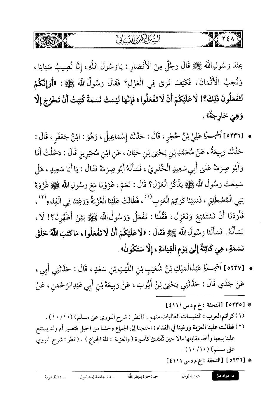 5237- أَخبَرنا عَبدُ المَلِكِ بنُ شُعَيْبِ بنِ اللَّيْثِ بنِ سَعْدٍ، قَالَ: حَدَّثني أَبي، عَن جَدِّي، قَالَ: حَدَّثني يَحْيَى بنُ أَيوبَ، عَن رَبِيعَةَ بنِ أَبي عَبدِ الرَّحمَنِ، عَن مُحَمدِ بنِ يَحْيَى بنِ حَبَّانَ، عَنِ ابْنِ مُحَيْرِيزٍ، قَالَ: دَخَلْتُ أَنَا وَأَبو صِرْمَةَ عَلَى أَبي سَعِيدٍ الخُدْرِيِّ، فَسَأَلْنَاهُ عَنِ العَزْلِ، فَقَالَ أَبو سَعِيدٍ: أَسَرْنَا نِسَاءَ بَنِي المُصْطَلِقِ، فَأَرَدْنَا أَنْ نَعْزِلَ، فَقَالَ بَعْضُنَا لِبَعْضٍ: تَعْزِلُونَ وَفِيكُمْ رَسُولُ اللهِ صَلى الله عَلَيهِ وسَلم لا تَسْأَلُونَهُ؟ فَقُلْنَا: يَا رَسُولَ اللهِ، أَسَرْنَا كَرَائِمَ العَرَبِ، أَسَرْنَا نِسَاءَ بَنِي المُصْطَلِقِ، وَأَرَدْنَا أَنْ نَعْزِلَ وَرَغِبْنَا فِي الفِدَاءِ، قَالَ رَسُولُ اللهِ صَلى الله عَلَيهِ وسَلم: لا عَلَيْكُمْ أَنْ لا تَفْعَلُوا، فَإِنَّهُ مَا مِنْ نَسَمَةٍ كَتَبَ اللهُ عَلَيْهَا أَنْ تَكُونَ إِلَى يَوْمِ القِيَامَةِ إِلاَّ وَهِيَ كَائِنَةٌ.