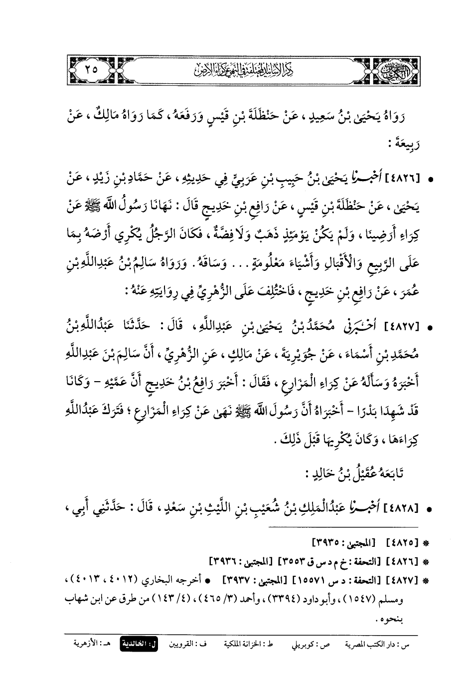 4826 - أَخبَرنا يَحْيَى بنُ حَبِيبِ بنِ عَرَبِيٍّ، فِي حَدِيثِهِ، عَن حَمَّادِ بنِ زَيْدٍ، عَن يَحْيَى، عَن حَنْظَلَةَ بنِ قَيْسٍ، عَن رَافِعِ بنِ خَدِيجٍ قَالَ: نَهَانَا رَسُولُ اللهِ صَلى الله عَلَيهِ وسَلم عَن كِرَاءِ أَرَضِينَا، وَلَمْ يَكُنْ يَوْمَئِذٍ ذَهَبٌ وَلا فِضَّةٌ، فَكَانَ الرَّجُلُ يُكْرِي أَرْضَهُ بِمَا عَلَى الرَّبِيعِ، وَالأَقْبَالِ، وَأَشْيَاءَ مَعْلُومَةٍ، ... وَسَاقَهُ.