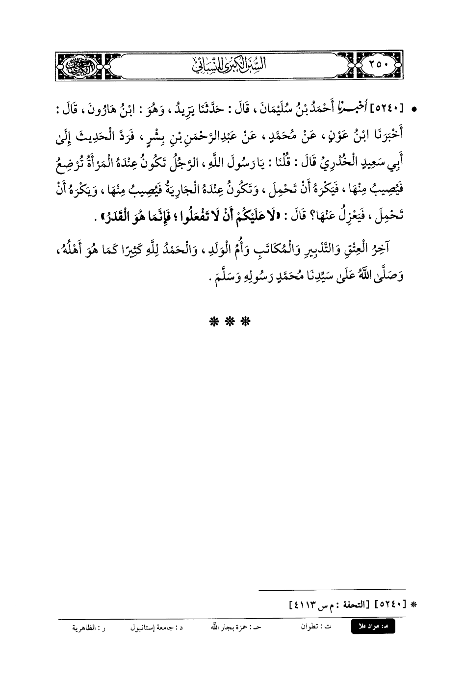 5240- أَخبَرنا أَحْمَدُ بنُ سُلَيْمَانَ، قَالَ: حَدَّثنا يَزِيدُ، وَهُوَ ابْنُ هَارُونَ، قَالَ: أَخبَرنا ابْنُ عَوْنٍ، عَن مُحَمدٍ، عَن عَبدِ الرَّحمَنِ بنِ بِشْرٍ، فَرَدَّ الحَدِيثَ إِلَى أَبي سَعِيدٍ الخُدْرِيِّ، قَالَ: قُلْنَا: يَا رَسُولَ اللهِ، الرَّجُلُ تَكُونُ عِنْدَُ المَرْأَةُ تُرْضِعُ، فَيُصِيبُ مِنْهَا، فَيَكْرَهُ أَنْ تَحْمِلَ، وَتَكُونُ عِنْدَهُ الجَارِيَةُ، فَيُصِيبُ مِنْهَا، وَيَكْرَهُ أَنْ تَحْمِلَ، فَيَعْزِلُ عَنهَا، قَالَ: لا عَلَيْكُمْ أَنْ لا تَفْعَلُوا، فَإِنَّمَا هُوَ القَدَرُ.