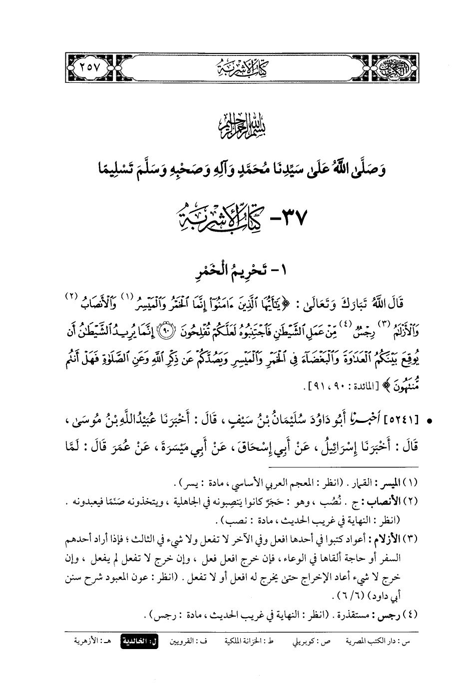 حَدَّثنا أَبو عَبدِ الرَّحمَنِ أَحْمَدُ بنُ شُعَيْبِ بنِ عَليِّ بنِ سِنَانٍ النَّسَائِيُّ، قَالَ: قَالَ اللهُ تَعَالَى وَتَبَارَكَ: {يَا أَيُّهَا الَّذِينَ آمَنُوا إِنَّمَا الخَمْرُ وَالمَيْسِرُ وَالأَنْصَابُ وَالأَزْلامُ رِجْسٌ مِنْ عَمَلِ الشَّيْطَانِ فَاجْتَنِبُوهُ لَعَلَّكُمْ تُفْلِحُونَ إِنَّمَا يُرِيدُ الشَّيْطَانُ أَنْ يُوقِعَ بَيْنَكُمُ العَدَاوَةَ وَالبَغْضَاءَ فِي الخَمْرِ وَالمَيْسِرِ وَيَصُدَّكُمْ عَن ذِكْرِ اللهِ وَعَنِ الصَّلاةِ فَهَلْ أَنْتُمْ مُنْتَهُونَ}.