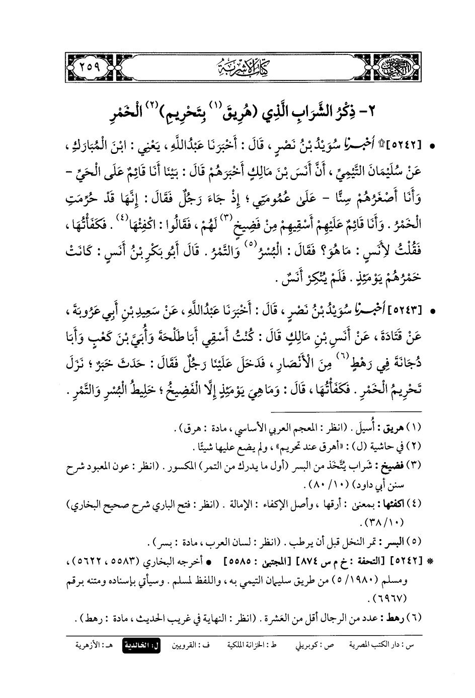 5242- أَخبَرنا سُوَيْدُ بنُ نَصْرٍ، قَالَ: أَخبَرنا عَبدُ اللهِ، يَعْنِي ابْنَ المُبَارَكِ، عَن سُلَيْمَانَ التَّيْمِيِّ، أَنَّ أَنَسَ بْنَ مَالِكٍ أَخْبَرَهُمْ قَالَ: بَيْنَا أَنَا قَائِمٌ عَلَى الحَيِّ، وَأَنَا أَصْغَرُهُمْ سِنًّا عَلَى عُمُومَتِي، إِذْ جَاءَ رَجُلٌ فَقَالَ: إِنَّهَا قَدْ حُرِّمَتِ الخَمْرُ، وَأَنَا قَائِمٌ عَلَيْهِمْ أَسْقِيهِمْ مِنْ فَضِيخٍ لَهُمْ، فَقَالُوا: اكْفِئْهَا، فَكَفَأْتُهَا، فَقُلْتُ لأَنَسٍ: مَا هُوَ؟ فقَالَ: البُسْرُ وَالتَّمْرُ.
