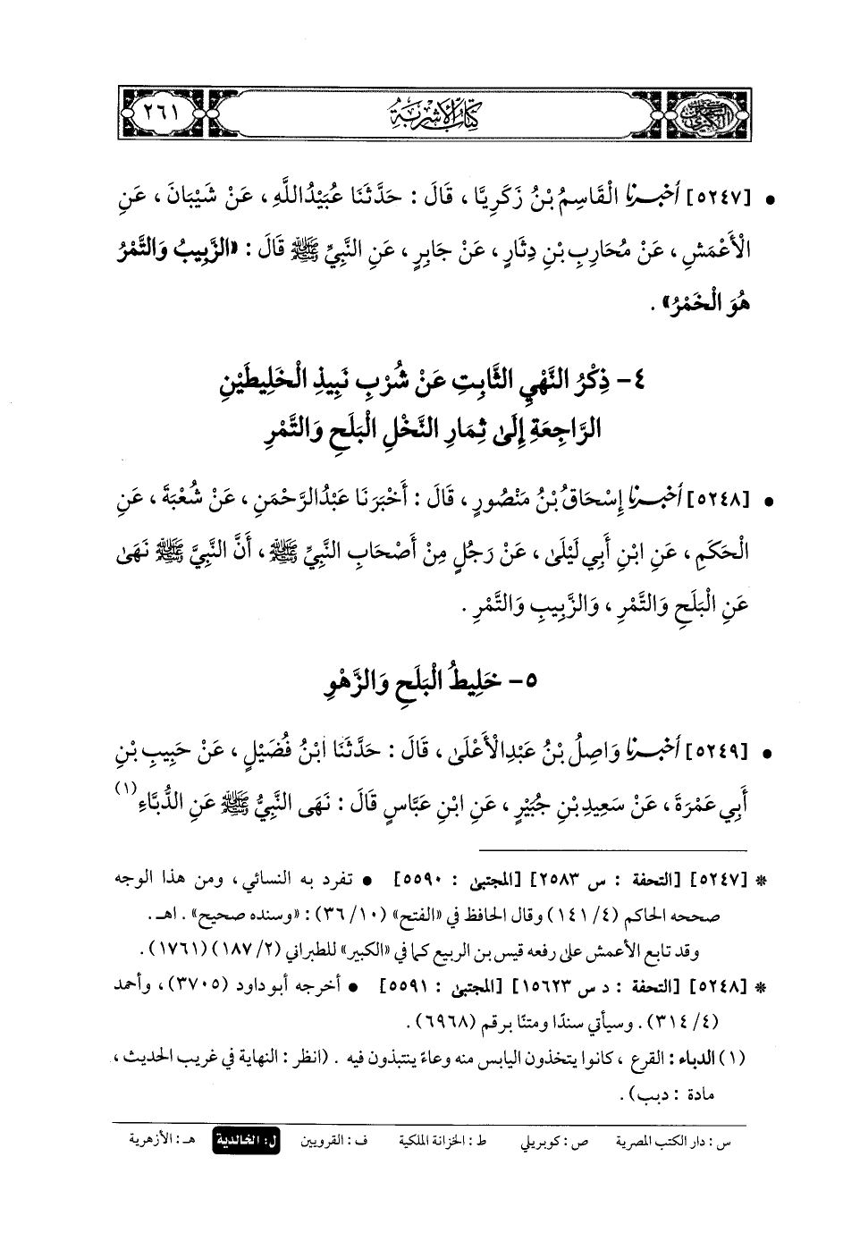 5249- أَخبَرنا وَاصِلُ بنُ عَبدِ الأَعْلَى، قَالَ: حَدَّثنا ابْنُ فُضَيْلٍ، عَن حَبِيبِ بنِ أَبي عَمْرَةَ، عَن سَعِيدِ بنِ جُبَيْرٍ، عَنِ ابْنِ عَبَّاسٍ، قَالَ: نَهَى النَّبيُّ صَلى الله عَلَيهِ وسَلم عَنِ الدُّبَّاءِ، وَالحَنْتَمِ، وَالمُزَفَّتِ، وَالنَّقِيرِ، وَأَنْ يُخْلَطَ البَلَحُ بِالزَّهْوِ.