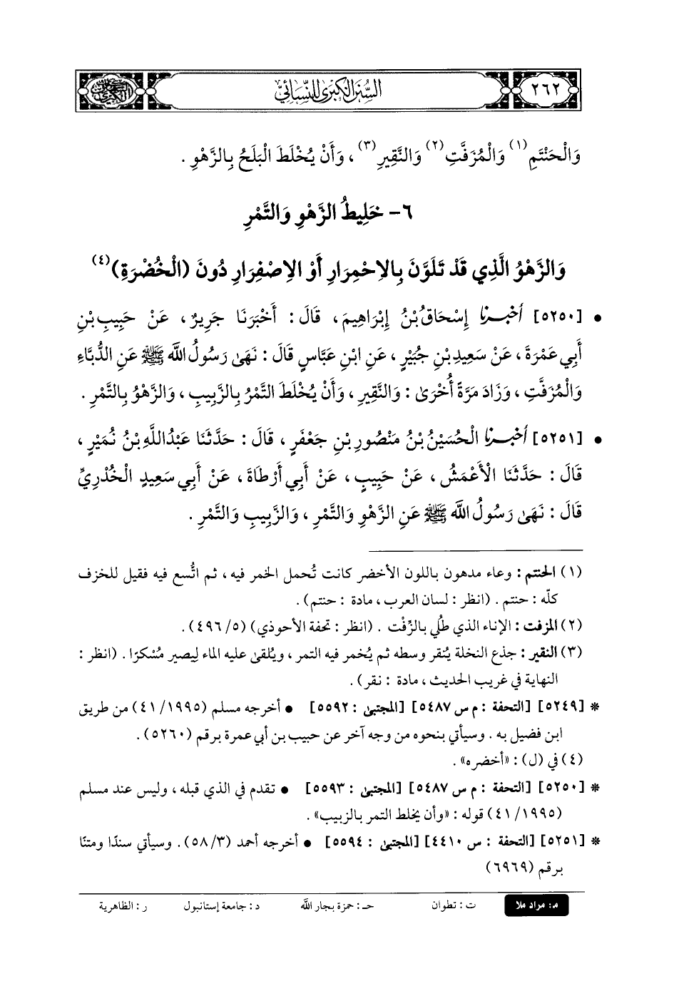 5251- أَخبَرنا الحُسَيْنُ بنُ مَنْصُورِ بنِ جَعْفَرٍ، قَالَ: حَدَّثنا عَبدُ اللهِ بنُ نُمَيْرٍ، قَالَ: حَدَّثنا الأَعْمَشُ، عَن حَبِيبٍ، عَن أَبي أَرْطَاةَ، عَن أَبي سَعِيدٍ الخُدْرِيِّ، قَالَ: نَهَى رَسُولُ اللهِ صَلى الله عَلَيهِ وسَلم عَنِ الزَّهْوِ وَالتَّمْرِ، وَالزَّبِيبِ وَالتَّمْرِ.