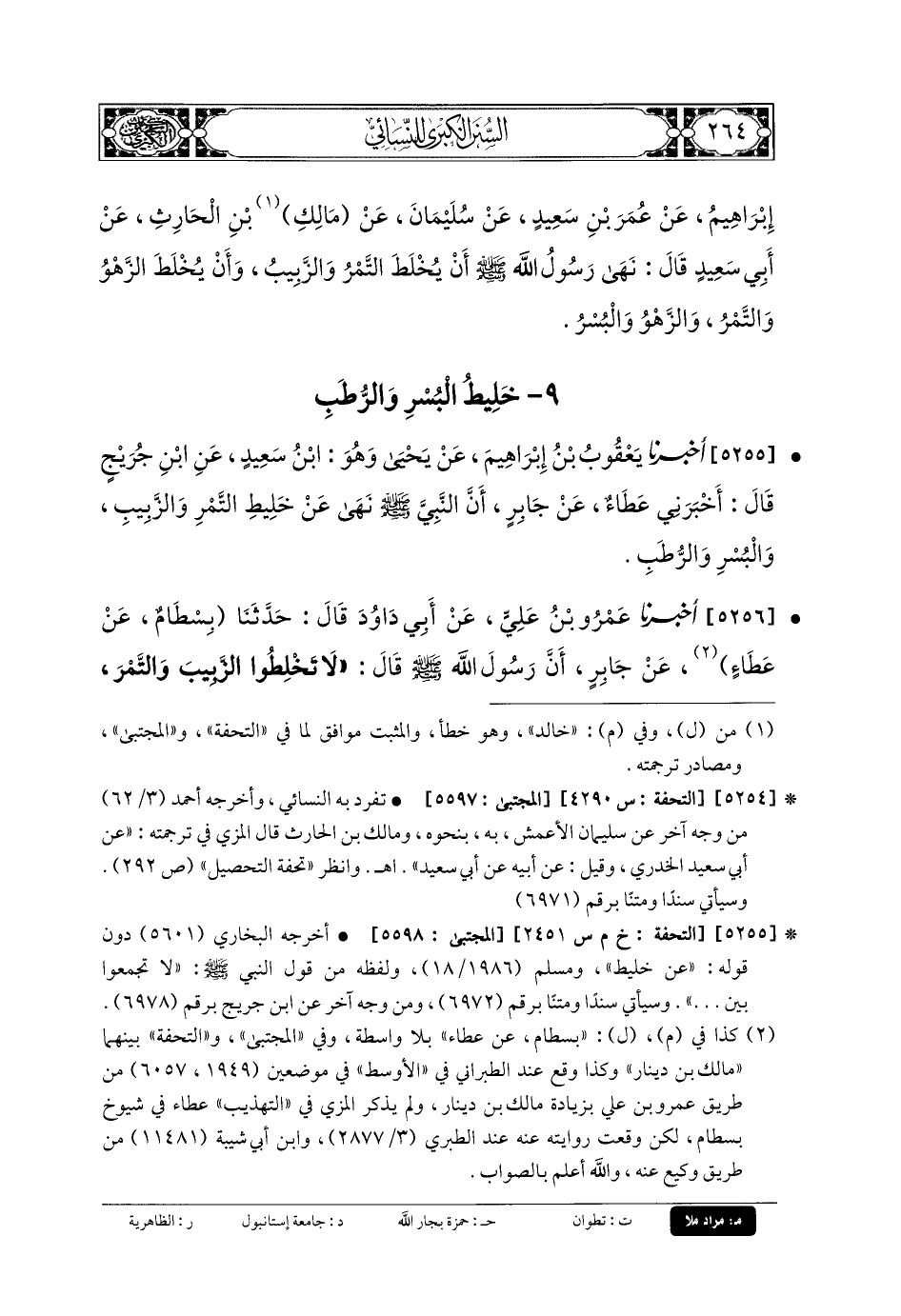 5256- أَخبَرنا عَمْرُو بنُ عَليٍّ، عَن أَبي دَاوُدَ، قَالَ: حَدَّثنا بِسْطَامٌ، قَالَ: حَدَّثنا مَالِكُ بنُ دِينَارٍ (1)، عَن عَطَاءٍ، عَن جَابِرٍ، أَنَّ رَسُولَ اللهِ صَلى الله عَلَيهِ وسَلم قَالَ: لا تَخْلِطُوا الزَّبِيبَ وَالتَّمْرَ، وَلا البُسْرَ وَالتَّمْرَ.