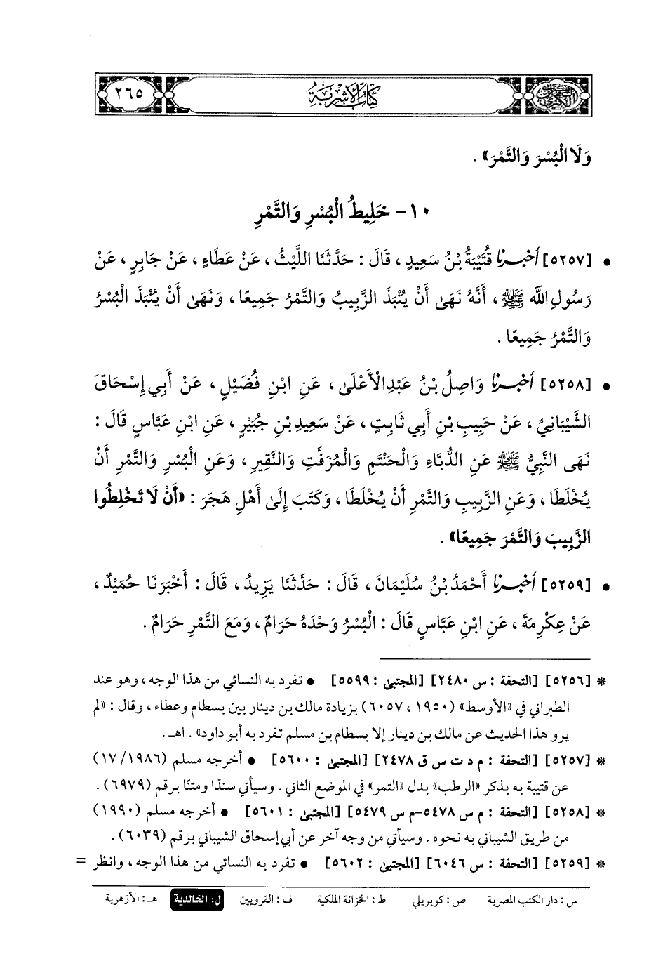 5258- أَخبَرنا وَاصِلُ بنُ عَبدِ الأَعْلَى، عَنِ ابْنِ فُضَيْلٍ، عَن أَبي إِسحَاقَ الشَّيْبَانِيِّ، عَن حَبِيبِ بنِ أَبي ثَابِتٍ، عَن سَعِيدِ بنِ جُبَيْرٍ، عَنِ ابْنِ عَبَّاسٍ، قَالَ: نَهَى النَّبيُّ صَلى الله عَلَيهِ وسَلم عَنِ الدُّبَّاءِ، وَالحَنْتَمِ، وَالمُزَفَّتِ، وَالنَّقِيرِ، وَعَنِ البُسْرِ وَالتَّمْرِ أَنْ يُخْلَطَا، وَعَنِ الزَّبِيبِ وَالتَّمْرِ أَنْ يُخْلَطَا، وَكَتَبَ إِلَى أَهْلِ هَجَرَ: أَنْ لا تَخْلِطُوا الزَّبِيبَ وَالتَّمْرَ جَمِيعًا.