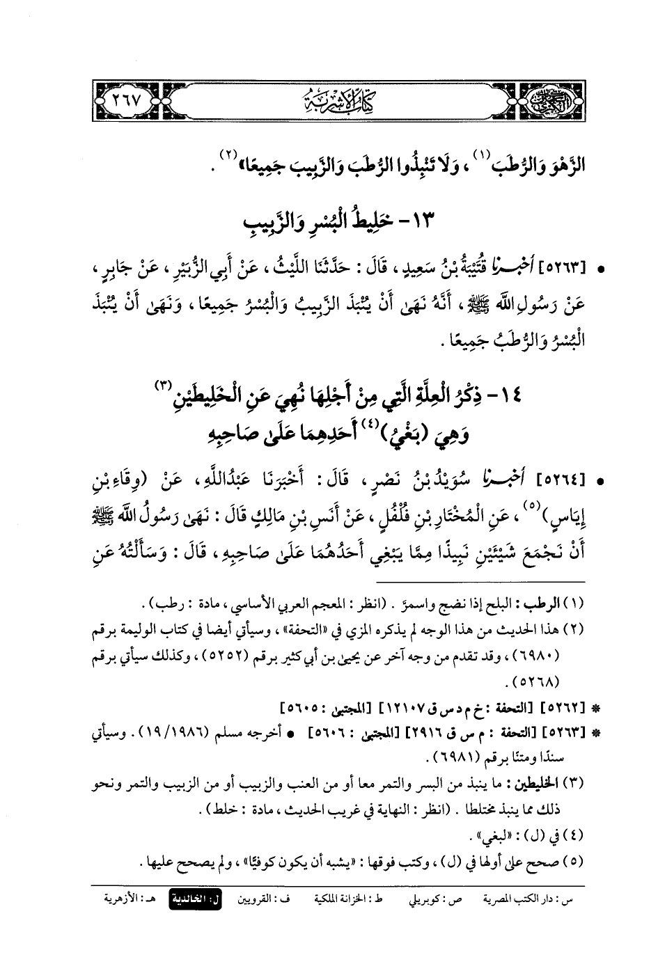5263- أَخبَرنا قُتَيبَةُ بنُ سَعِيدٍ، قَالَ: حَدَّثنا اللَّيْثُ، عَن أَبي الزُّبَيْرِ، عَن جَابِرٍ، عَن رَسُولِ اللهِ صَلى الله عَلَيهِ وسَلم، أَنَّهُ نَهَى أَنْ يُنْبَذَ الزَّبِيبُ وَالبُسْرُ جَمِيعًا، وَنَهَى أَنْ يُنْبَذَ البُسْرُ وَالرُّطَبُ جَمِيعًا.