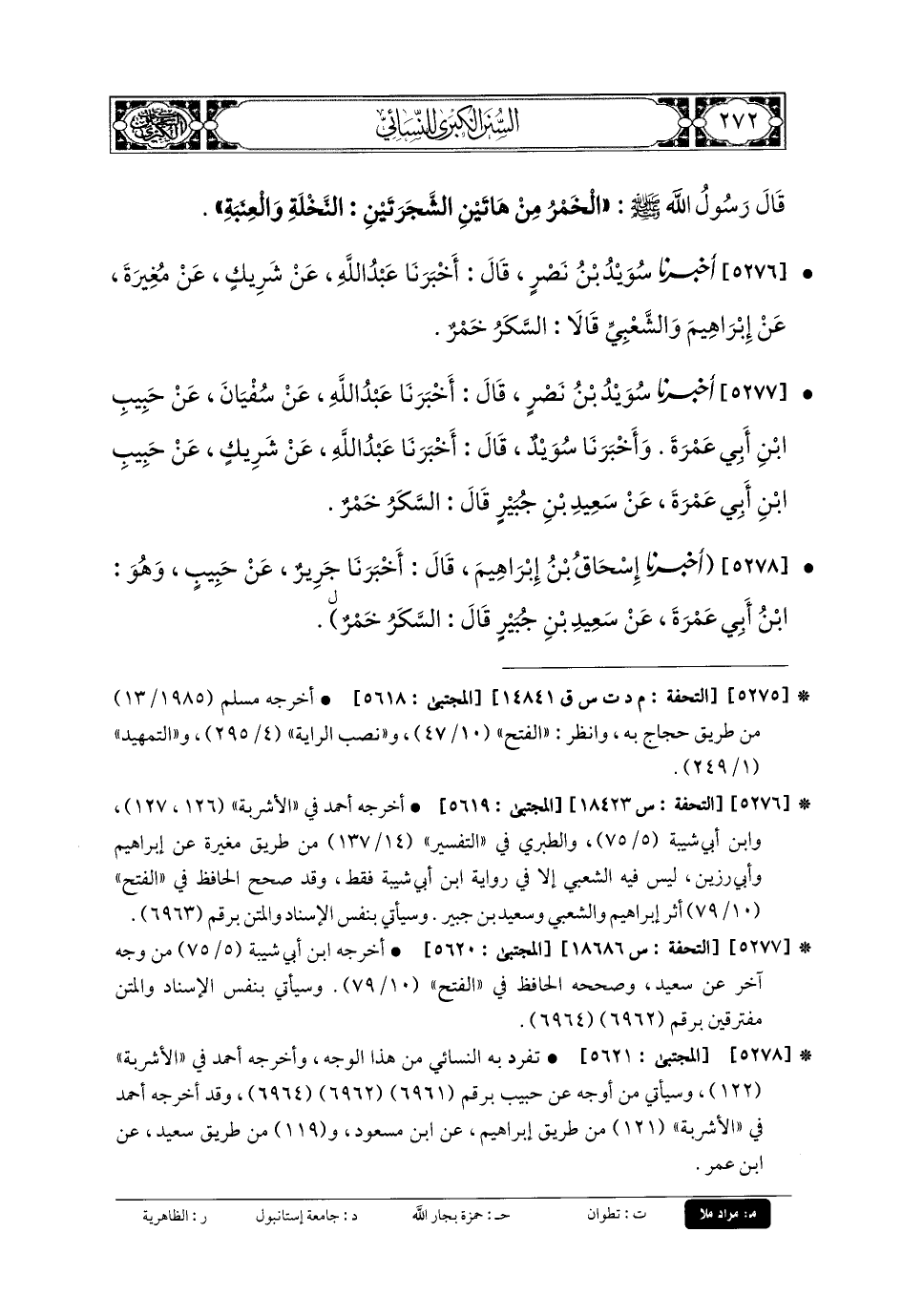 5278- أَخبَرنا إِسحَاقُ بنُ إِبْرَاهِيمَ، قَالَ: أَخبَرنا جَرِيرٌ، عَن حَبِيبٍ، وَهُوَ ابْنُ أَبي عَمْرَةَ، عَن سَعِيدِ بنِ جُبَيْرٍ، قَالَ: السَّكَرُ خَمْرٌ (1).