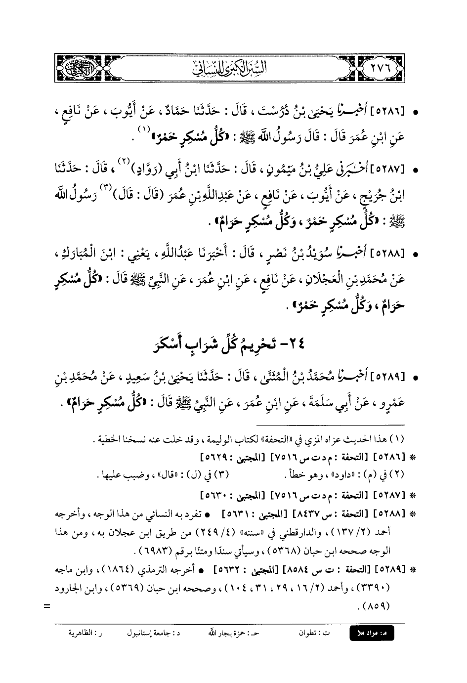 5286- أَخبَرنا يَحْيَى بنُ دُرُسْتَ، قَالَ: حَدَّثنا حَمَّادٌ، عَن أَيوبَ، عَن نَافِعٍ، عَنِ ابْنِ عُمَرَ، قَالَ: قَالَ رَسُولُ اللهِ صَلى الله عَلَيهِ وسَلم: كُلُّ مُسْكِرٍ خَمْرٌ.