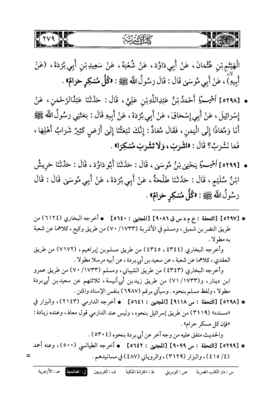 5299- أَخبَرنا يَحْيَى بنُ مُوسَى، قَالَ: حَدَّثنا أَبو دَاوُدَ، قَالَ: حَدَّثنا حَرِيشُ بنُ سُلَيْمٍ، قَالَ: حَدَّثنا طَلْحَةُ، عَن أَبي بُرْدَةَ، عَن أَبي مُوسَى، قَالَ: قَالَ رَسُولُ اللهِ صَلى الله عَلَيهِ وسَلم: كُلُّ مُسْكِرٍ حَرَامٌ.