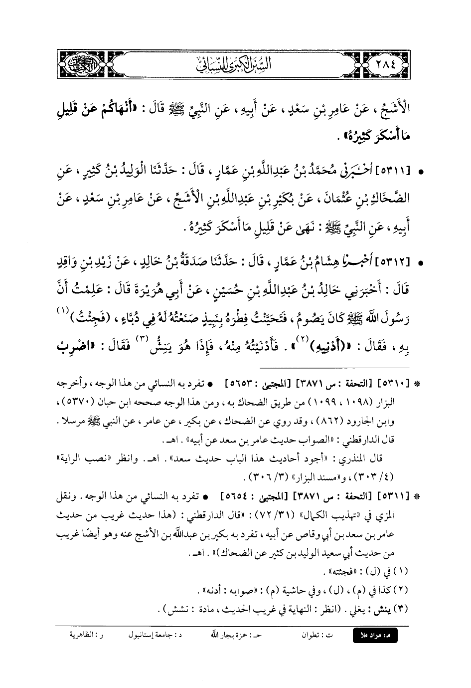 5311- أَخْبَرَنِي مُحَمدُ بنُ عَبدِ اللهِ بنِ عَمَّارٍ، قَالَ: حَدَّثنا الوَلِيدُ بْنُ كَثِيرٍ، عَنِ الضَّحَّاكِ بنِ عُثْمَانَ، عَن بُكَيْرِ بنِ عَبدِ اللهِ بنِ الأَشَجِّ، عَن عَامِرِ بنِ سَعْدٍ، عَن أَبيهِ، عَنِ النَّبيِّ صَلى الله عَلَيهِ وسَلم نَهَى عَن قَلِيلِ مَا أَسْكَرَ كَثِيرُهُ.