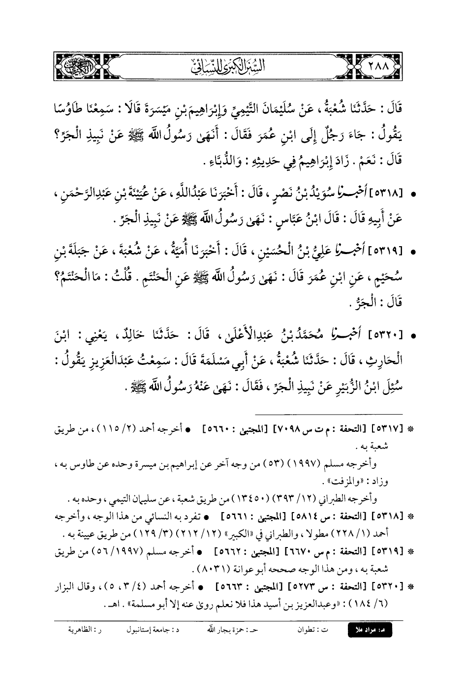 5319- أَخبَرنا عَليُّ بنُ الحُسَيْنِ، قَالَ: أَخبَرنا أُمَيَّةُ، عَن شُعْبَةَ، عَن جَبَلَةَ بنِ سُحَيْمٍ، عَنِ ابْنِ عُمَرَ، قَالَ: نَهَى رَسُولُ اللهِ صَلى الله عَلَيهِ وسَلم عَنِ الحَنْتَمِ، قُلْتُ: مَا الحَنْتَمُ؟ قَالَ: الجَرُّ.