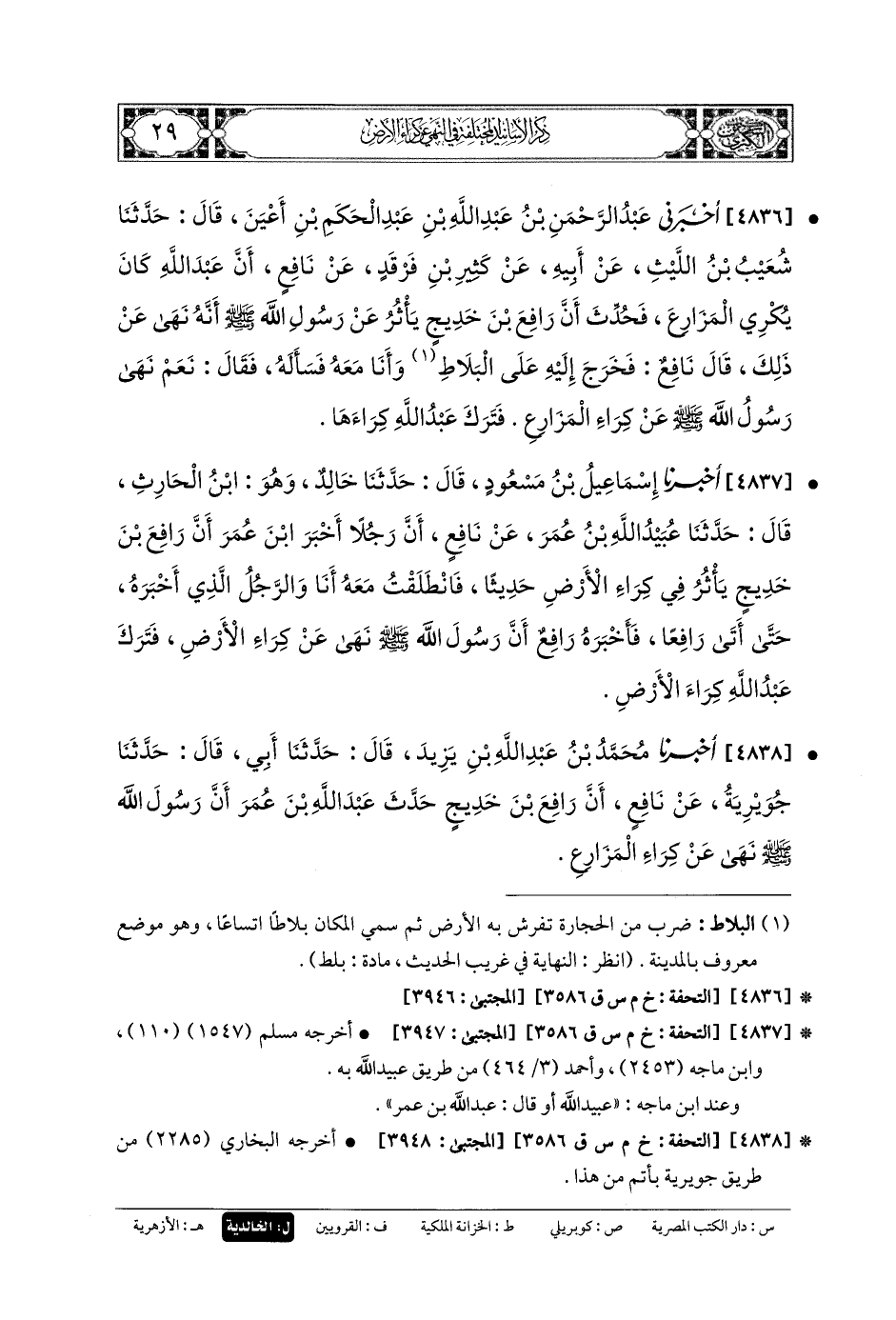 4836 - أَخْبَرَنِي عَبدُ الرَّحمَنِ بنُ عَبدِ اللهِ بنِ عَبدِ الحَكَمِ بنِ أَعْيَنَ، قَالَ: حَدَّثنا شُعَيْبُ بنُ اللَّيْثِ، عَن أَبيهِ، عَن كَثِيرِ بنِ فَرْقَدَ، عَن نَافِعٍ، أَنَّ عَبدَ اللهِ كَانَ يُكْرِي المَزَارِعَ، فَحُدِّثَ أَنَّ رَافِعَ بْنَ خَدِيجٍ يَأْثُرُ عَن رَسُولِ اللهِ صَلى الله عَلَيهِ وسَلم، أَنَّهُ نَهَى عَن ذَلِكَ، قَالَ نَافِعٌ: فَخَرَجَ إِلَيْهِ عَلَى البَلاطِ وَأَنَا مَعَهُ، فَسَأَلَهُ فَقَالَ: نَعَمْ، نَهَى رَسُولُ اللهِ صَلى الله عَلَيهِ وسَلم عَن كِرَاءِ المَزَارِعِ، فَتَرَكَ عَبدُ اللهِ كِرَاءَهَا.