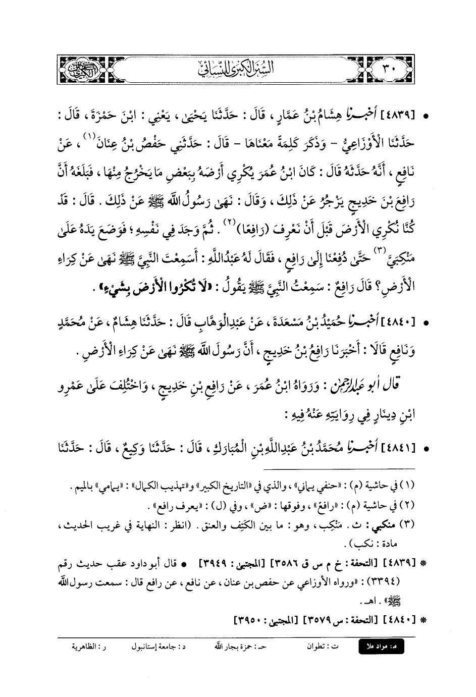 4839 - أَخبَرنا هِشَامُ بنُ عَمَّارٍ، قَالَ: حَدَّثنا يَحْيَى، يَعْنِي ابْنَ حَمْزَةَ، قَالَ: حَدَّثنا الأَوْزَاعِيُّ، وَذَكَرَ كَلِمَةً مَعْنَاهَا، قَالَ: حَدَّثني حَفْصُ بنُ عِنَانَ، عَن نَافِعٍ، أَنَّهُ حَدَّثَهُ قَالَ: كَانَ ابْنُ عُمَرَ يُكْرِي أَرْضَهُ بِبَعْضِ مَا يَخْرُجُ مِنْهَا، فَبَلَغَهُ أَنَّ رَافِعَ بْنَ خَدِيجٍ يَزْجُرُ عَن ذَلِكَ، وَقَالَ: نَهَى رَسُولُ اللهِ صَلى الله عَلَيهِ وسَلم عَن ذَلِكَ، قَالَ: قَدْ كُنَّا نُكْرِي الأَرْضَ قَبْلَ أَنْ نَعْرِفَ رَافِعًا، ثُمَّ وَجَدَ فِي نَفْسِهِ، فَوَضَعَ يَدَهُ عَلَى مَنْكِبَيَّ، حَتَّى دُفِعْنَا إِلَى رَافِعٍ، فَقَالَ لَهُ عَبدُ اللهِ: أَسَمِعْتَ النَّبيَّ صَلى الله عَلَيهِ وسَلم نَهَى عَن كِرَاءِ الأَرْضِ؟ قَالَ رَافِعٌ: سَمِعْتُ النَّبيَّ صَلى الله عَلَيهِ وسَلم يَقُولُ: لا تُكْرُوا الأَرْضَ بِشَيْءٍ.