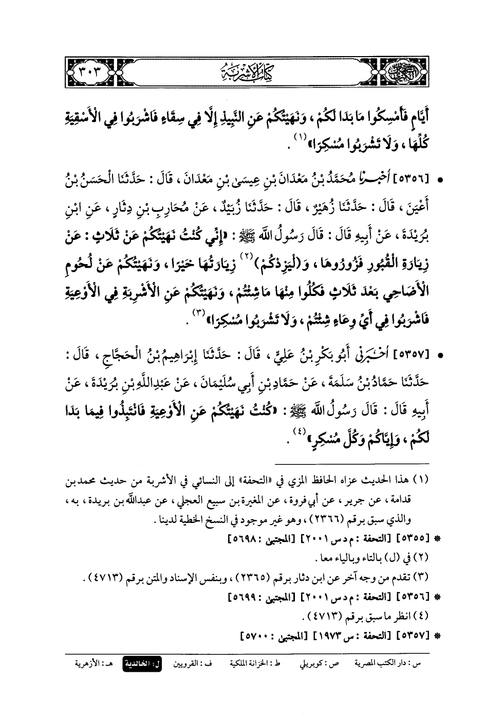 5357- أَخْبَرَنِي أَبو بَكْرِ بنُ عَليٍّ، قَالَ: حَدَّثنا إِبْرَاهِيمُ بنُ الحَجَّاجِ، قَالَ: حَدَّثنا حَمَّادُ بنُ سَلَمَةَ، عَن حَمَّادِ بنِ أَبي سُلَيْمَانَ، عَن عَبدِ اللهِ بنِ بُرَيْدَةَ، عَن أَبيهِ، قَالَ: قَالَ رَسُولُ اللهِ صَلى الله عَلَيهِ وسَلم: كُنْتُ نَهَيْتُكُمْ عَنِ الأَوْعِيَةِ، فَانْتَبِذُوا فِيمَا بَدَا لَكُمْ، وَإِيَّاكُمْ وَكُلَّ مُسْكِرٍ.