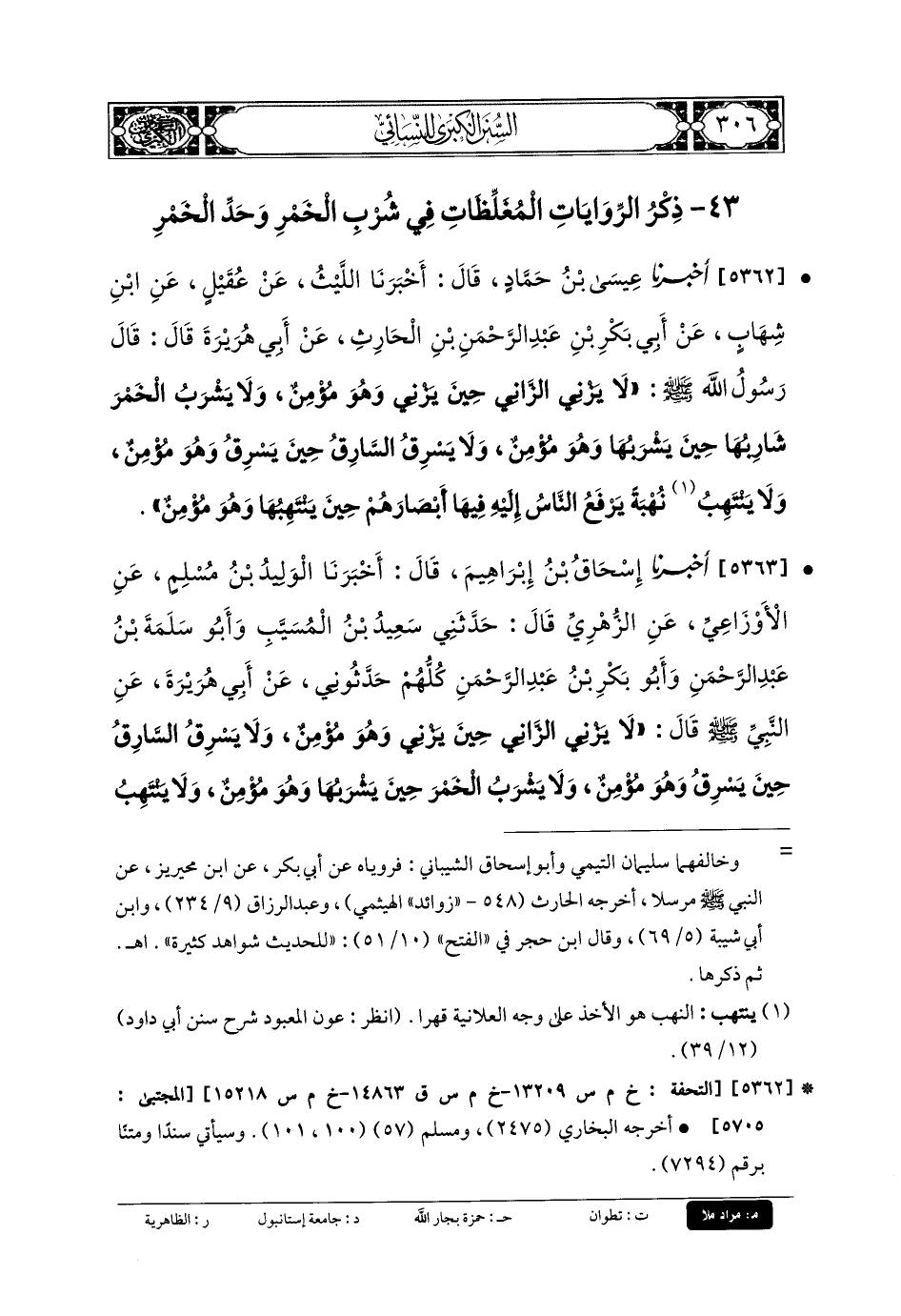 5362- أَخبَرنا عِيسَى بنُ حَمَّادٍ، قَالَ: أَخبَرنا اللَّيْثُ، عَن عُقَيْلٍ، عَنِ ابْنِ شِهَابٍ، عَن أَبي بَكْرِ بنِ عَبدِ الرَّحمَنِ بنِ الحَارِثِ، عَن أَبي هُرَيْرَةَ، قَالَ: قَالَ رَسُولُ اللهِ صَلى الله عَلَيهِ وسَلم: لا يَزْنِي الزَّانِي حِينَ يَزْنِي وَهُوَ مُؤْمِنٌ، وَلا يَشْرَبُ الخَمْرَ شَارِبُهَا حِينَ يَشْرَبُهَا وَهُوَ مُؤْمِنٌ، وَلا يَسْرِقُ السَّارِقُ حِينَ يَسْرِقُ وَهُوَ مُؤْمِنٌ، وَلا يَنْتَهِبُ نُهْبَةً يَرْفَعُ النَّاسُ إِلَيْهِ فِيهَا أَبْصَارَهُمْ حِينَ يَنْتَهِبُهَا وَهُوَ مُؤْمِنٌ.