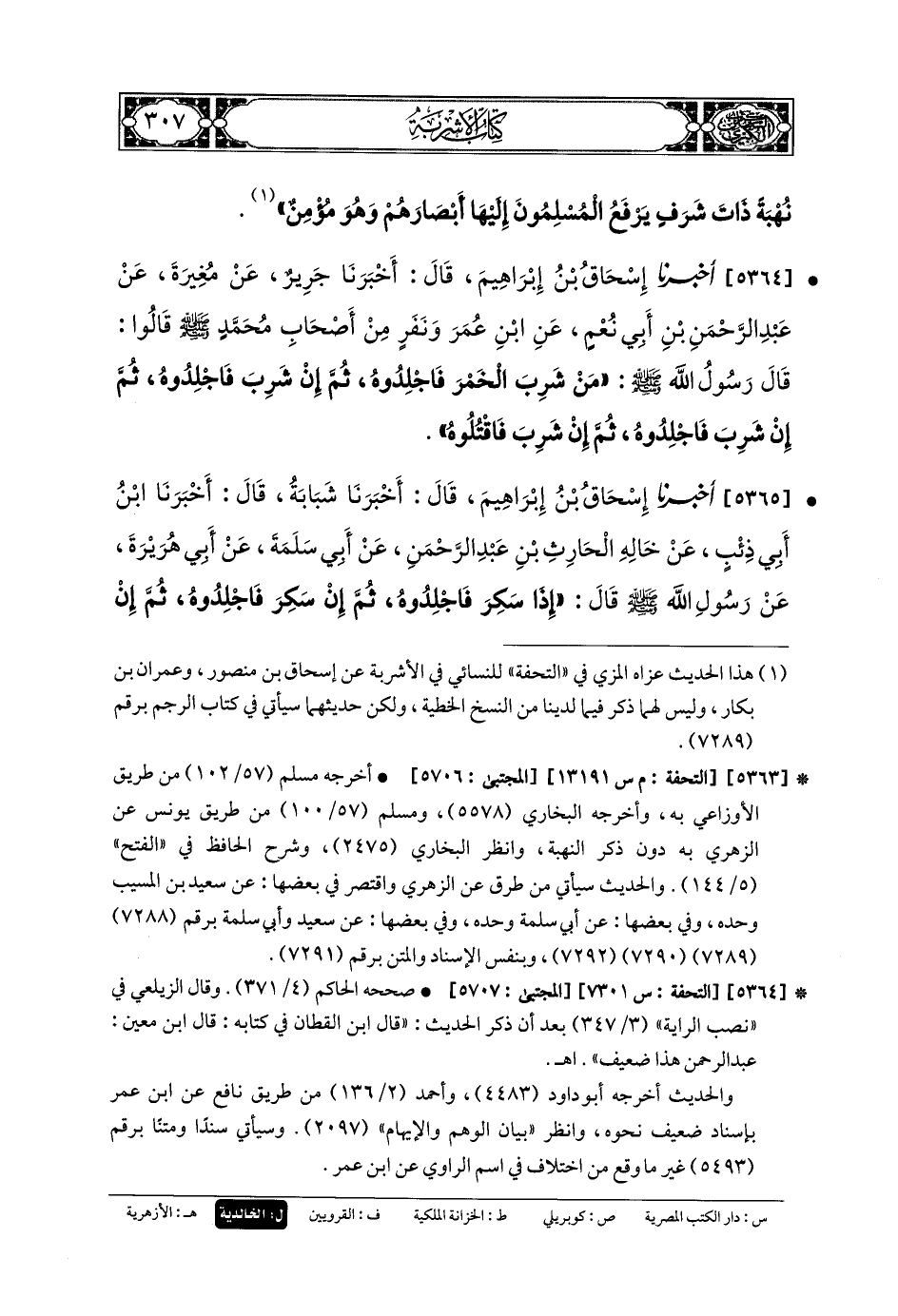 5364- أَخبَرنا إِسحَاقُ بنُ إِبْرَاهِيمَ، قَالَ: أَخبَرنا جَرِيرٌ، عَن مُغِيرَةَ، عَن عَبدِ الرَّحمَنِ بنِ أَبي نُعْمٍ، عَنِ ابْنِ عُمَرَ، وَنَفَرٍ مِنْ أَصْحَابِ مُحَمدٍ صَلى الله عَلَيهِ وسَلم قَالُوا: قَالَ رَسُولُ اللهِ صَلى الله عَلَيهِ وسَلم: مَنْ شَرِبَ الخَمْرَ فَاجْلِدُوهُ، ثُمَّ إِنْ شَرِبَ فَاجْلِدُوهُ، ثُمَّ إِنْ شَرِبَ فَاجْلِدُوهُ، ثُمَّ إِنْ شَرِبَ فَاقْتُلُوهُ.