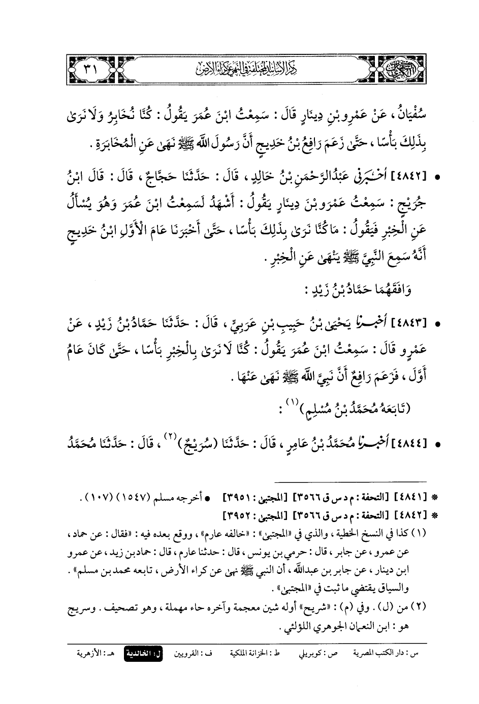 4843 - أَخبَرنا يَحْيَى بنُ حَبِيبِ بنِ عَرَبِيٍّ، قَالَ: حَدَّثنا حَمَّادُ بنُ زَيْدٍ، عَن عَمْرٍو، قَالَ: سَمِعْتُ ابْنَ عُمَرَ يَقُولُ: كُنَّا لا نَرَى بِالخِبْرِ بَأْسًا، حَتَّى كَانَ عَامَ أَوَّلَ، فَزَعَمَ رَافِعٌ، أَنَّ نَبِيَّ اللهِ صَلى الله عَلَيهِ وسَلم نَهَى عَنهَا.