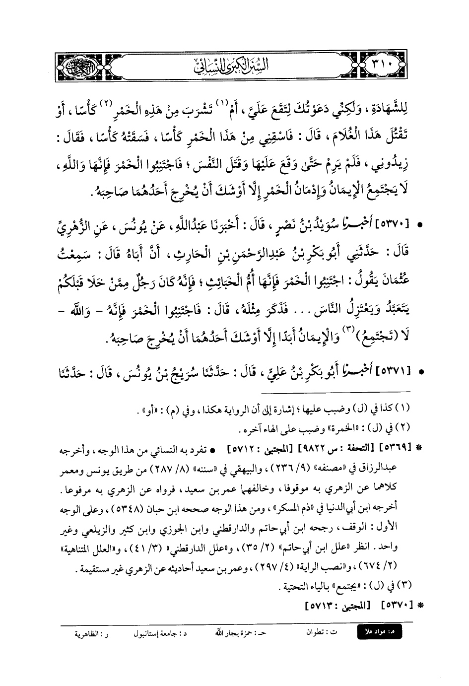 5370- أَخبَرنا سُوَيْدُ بنُ نَصْرٍ، قَالَ: أَخبَرنا عَبدُ اللهِ، عَن يُونُسَ، عَنِ الزُّهْرِيِّ، قَالَ: حَدَّثني أَبو بَكْرِ بنُ عَبدِ الرَّحمَنِ بنِ الحَارِثِ، أَنَّ أَبَاهُ، قَالَ: سَمِعْتُ عُثْمَانَ يَقُولُ: اجْتَنِبُوا الخَمْرَ فَإِنَّهَا أُمُّ الخَبَائِثِ؛ فَإِنَّهُ كَانَ رَجُلٌ مِمَّنْ خَلا قَبْلَكُمْ يَتَعَبَّدُ، وَيَعْتَزِلُ النَّاسَ ... فَذَكَرَ مِثْلَهُ، قَالَ: فَاجْتَنِبُوا الخَمْرَ فَإِنَّهُ وَاللهِ لا تَجْتَمِعُ وَالإِيمَانُ أَبَدًا إِلاَّ أَوْشَكَ أَحَدُهُمَا أَنْ يُخْرِجَ صَاحِبَهُ.