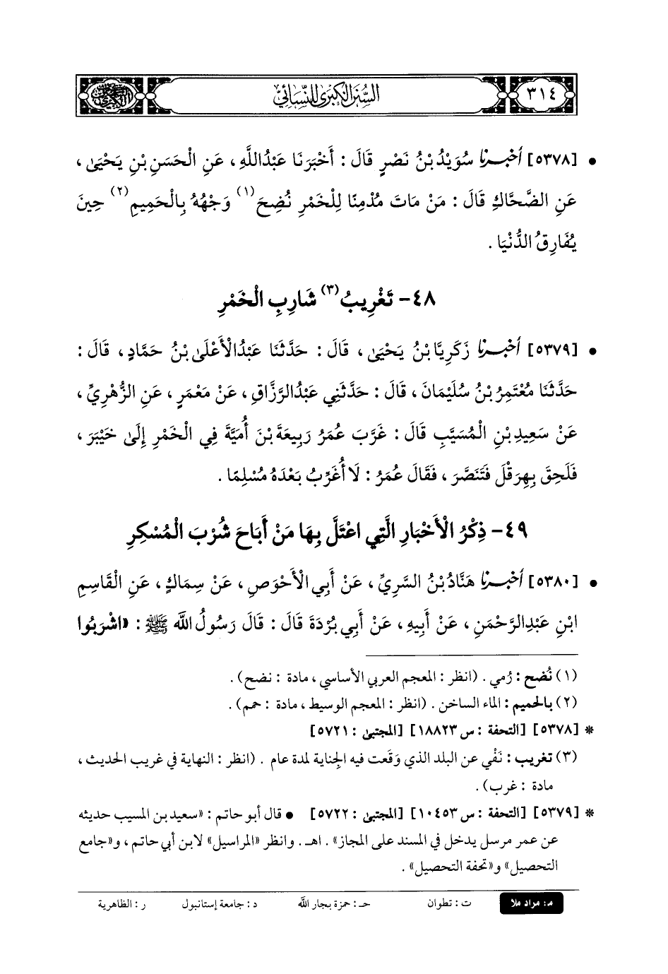 5379- أَخبَرنا زَكَرِيَّا بنُ يَحْيَى، قَالَ: حَدَّثنا عَبدُ الأَعْلَى بنُ حَمَّادٍ، قَالَ: حَدَّثنا مُعْتَمِرُ بنُ سُلَيْمَانَ، قَالَ: حَدَّثني عَبدُ الرَّزَّاقِ، عَن مَعْمَرٍ، عَنِ الزُّهْرِيِّ، عَن سَعِيدِ بنِ المُسَيَّبِ، قَالَ: غَرَّبَ عُمَرُ رَبِيعَةَ بْنَ أُمَيَّةَ فِي الخَمْرِ إِلَى خَيْبَرَ، فَلَحِقَ بِهِرَقْلَ، فَتَنَصَّرَ، فَقَالَ عُمَرُ: لا أُغَرِّبُ بَعْدَهُ مُسْلِمًا.