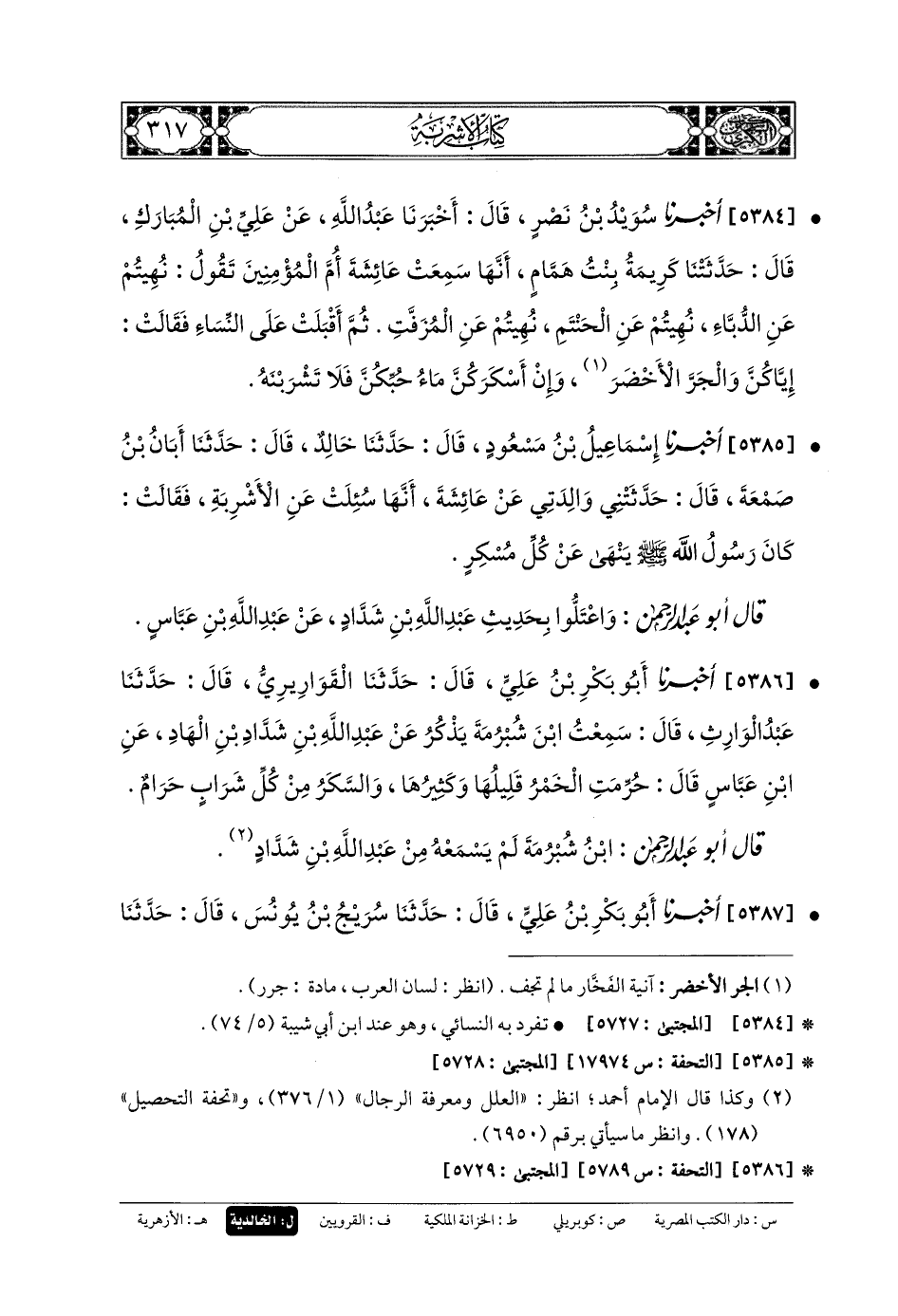 5384- أَخبَرنا سُوَيْدُ بنُ نَصْرٍ، قَالَ: أَخبَرنا عَبدُ اللهِ، عَن عَليِّ بنِ المُبَارَكِ، قَالَ: حَدَّثَتْنَا كَرِيمَةُ بِنْتُ هَمَّامٍ، أَنَّهَا سَمِعَتْ عَائِشَةَ أُمَّ المُؤْمِنِينَ تَقُولُ: نُهِيتُمْ عَنِ الدُّبَّاءِ، نُهِيتُمْ عَنِ الحَنْتَمِ، نُهِيتُمْ عَنِ المُزَفَّتِ، ثُمَّ أَقْبَلَتْ عَلَى النِّسَاءِ فَقَالَتْ: إِيَّاكُنَّ وَالجَرَّ الأَخْضَرَ، وَإِنْ أَسْكَرَكُنَّ مَاءُ حُبِّكُنَّ فَلا تَشْرَبْنَهُ.