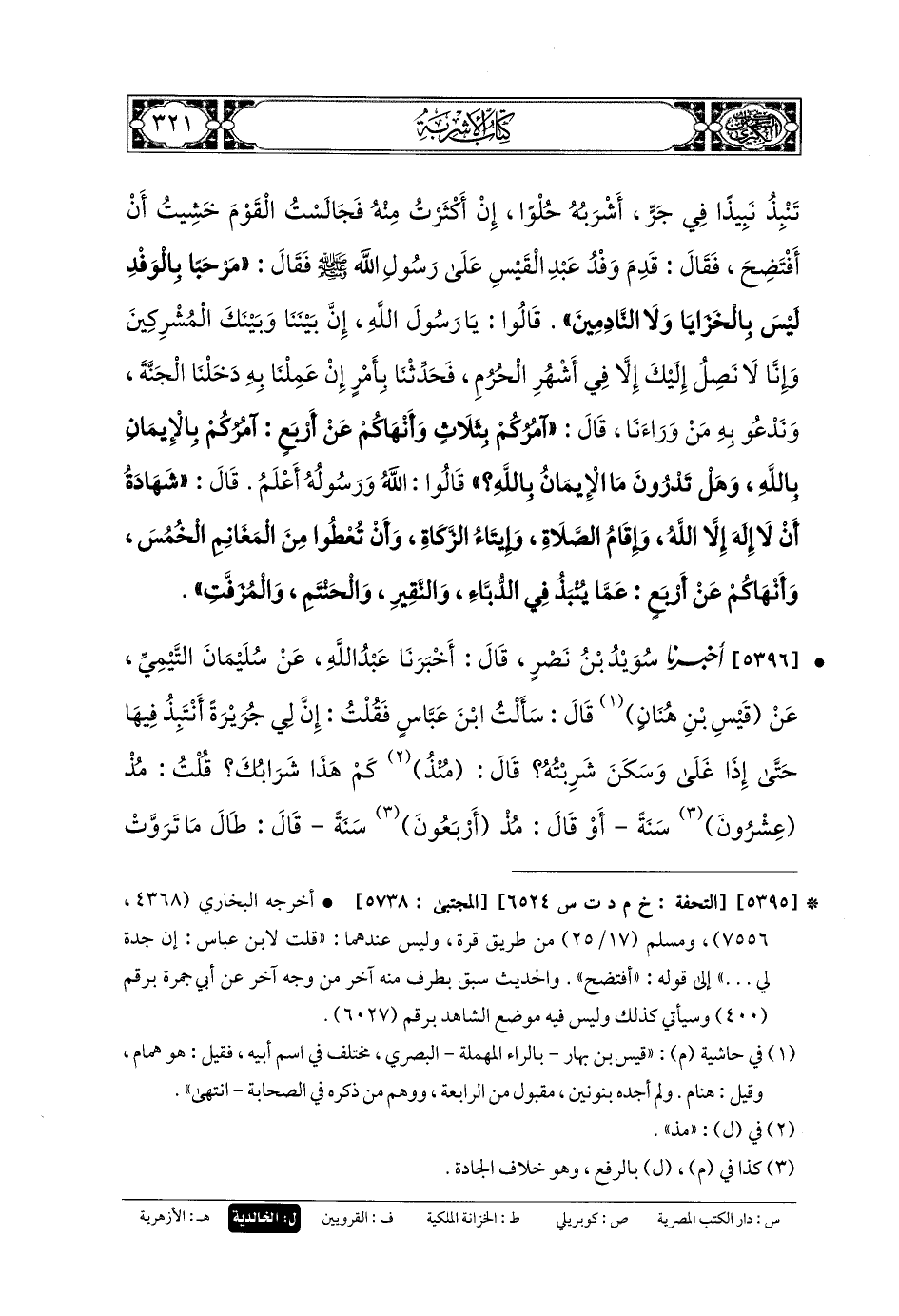 5396- أَخبَرنا سُوَيْدُ بنُ نَصْرٍ، قَالَ: أَخبَرنا عَبدُ اللهِ، عَن سُلَيْمَانَ التَّيْمِيِّ، عَن قَيْسِ بنِ هُنَانٍ، قَالَ: سَأَلْتُ ابْنَ عَبَّاسٍ فَقُلْتُ: إِنَّ لِي جُرَيْرَةً أَنْتَبِذُ فِيهَا حَتَّى إِذَا غَلَى وَسَكَنَ شَرِبْتُهُ، قَالَ: مُنْذُ كَمْ هَذَا شَرَابُكَ؟ قُلْتُ: مُذْ عِشْرُونَ سَنَةً، أَوْ قَالَ: مُذْ أَرْبَعُونَ سَنَةً، قَالَ: طَالَمَا مَا تَرَوَّتْ عُرُوقُكَ مِنَ الخَبَثِ.