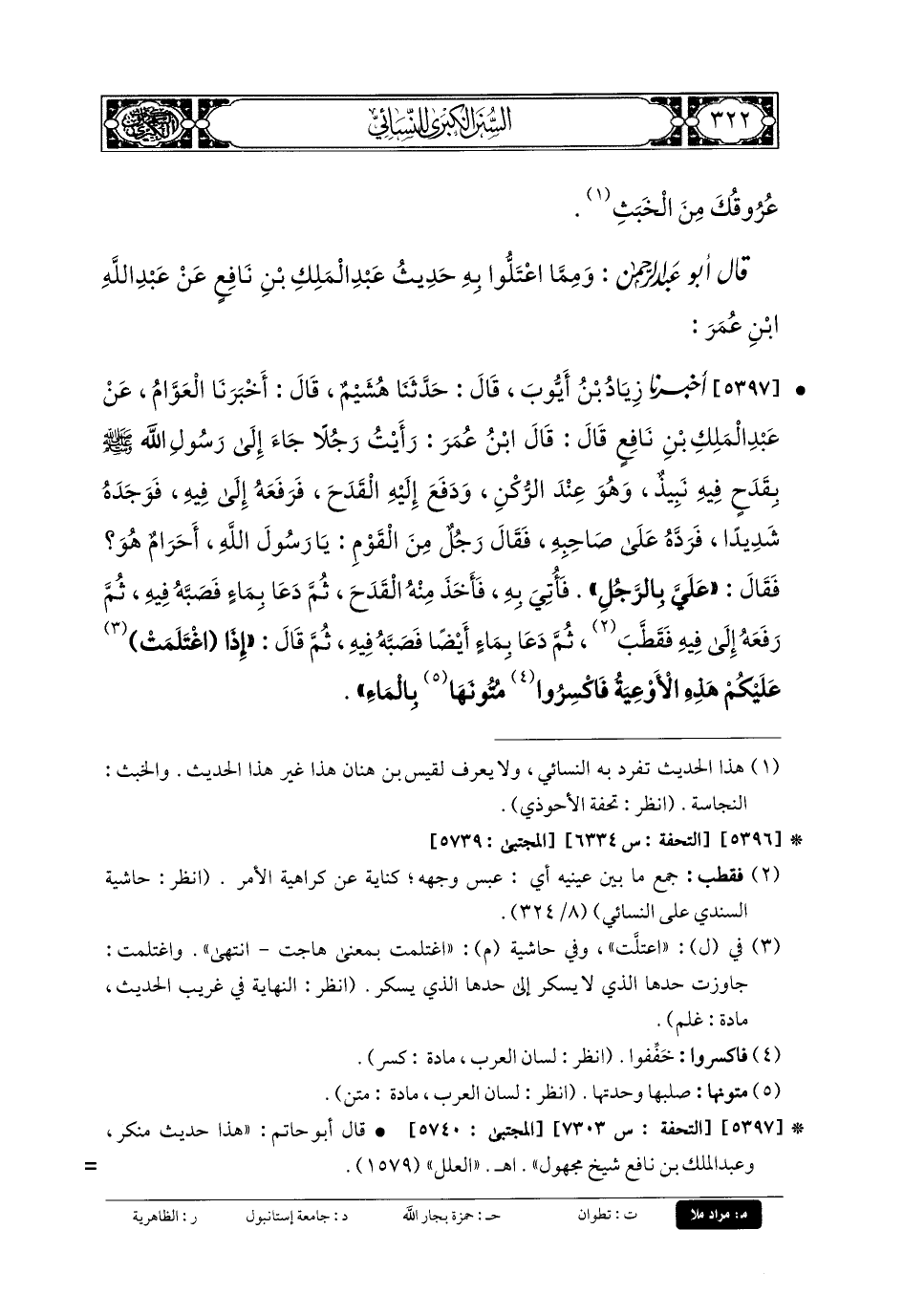 5397- أَخبَرنا زِيَادُ بنُ أَيوبَ، قَالَ: حَدَّثنا هُشَيْمٌ، قَالَ: أَخبَرنا العَوَّامُ، عَن عَبدِ المَلِكِ بنِ نَافِعٍ، قَالَ: قَالَ ابْنُ عُمَرَ: رَأَيْتُ رَجُلاً جَاءَ إِلَى رَسُولِ اللهِ صَلى الله عَلَيهِ وسَلم بِقَدَحٍ فِيهِ نَبِيذٌ، وَهُوَ عِنْدَ الرُّكْنِ، وَدَفَعَ إِلَيْهِ القَدَحَ، فَرَفَعَهُ إِلَى فِيهِ فَوَجَدَهُ شَدِيدًا، فَرَدَّهُ عَلَى صَاحِبِهِ، فَقَالَ رَجُلٌ مِنَ القَوْمِ: يَا رَسُولَ اللهِ، أَحَرَامٌ هُوَ؟ فَقَالَ: عَلَيَّ بِالرَّجُلِ، فَأُتِيَ بِهِ فَأَخَذَ مِنْهُ القَدَحَ، ثُمَّ دَعَا بِمَاءٍ فَصَبَّهُ فِيهِ، ثُمَّ رَفَعَهُ إِلَى فِيهِ فَقَطَّبَ، ثُمَّ دَعَا بِمَاءٍ أَيْضًا فَصَبَّهُ فِيهِ، ثُمَّ قَالَ: إِذَا اغْتَلَمَتْ عَلَيْكُمْ هَذِهِ الأَوْعِيَةُ، فَاكْسِرُوا مُتُونَهَا بِالمَاءِ.